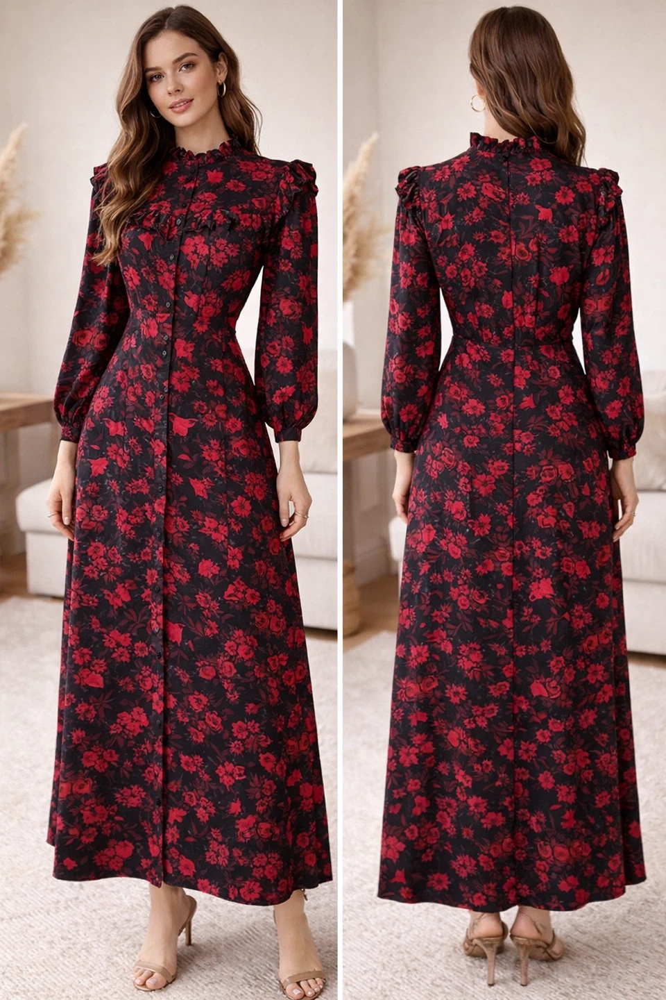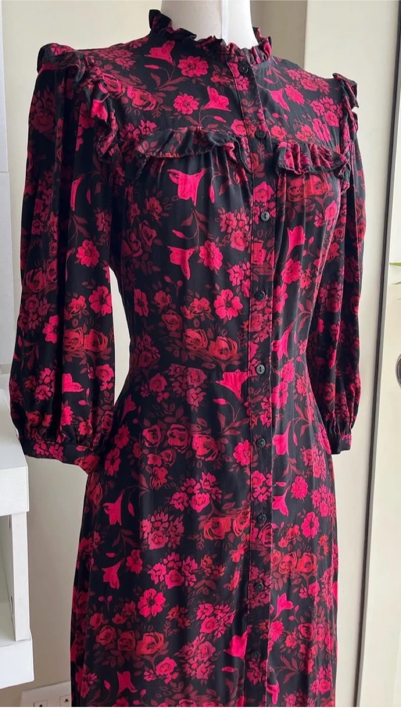 A black midi dress by Primark featuring a vibrant floral print in shades of pink and red. It has a button-up front, long balloon sleeves, and ruffled details on the collar and chest. Size is UK 10.