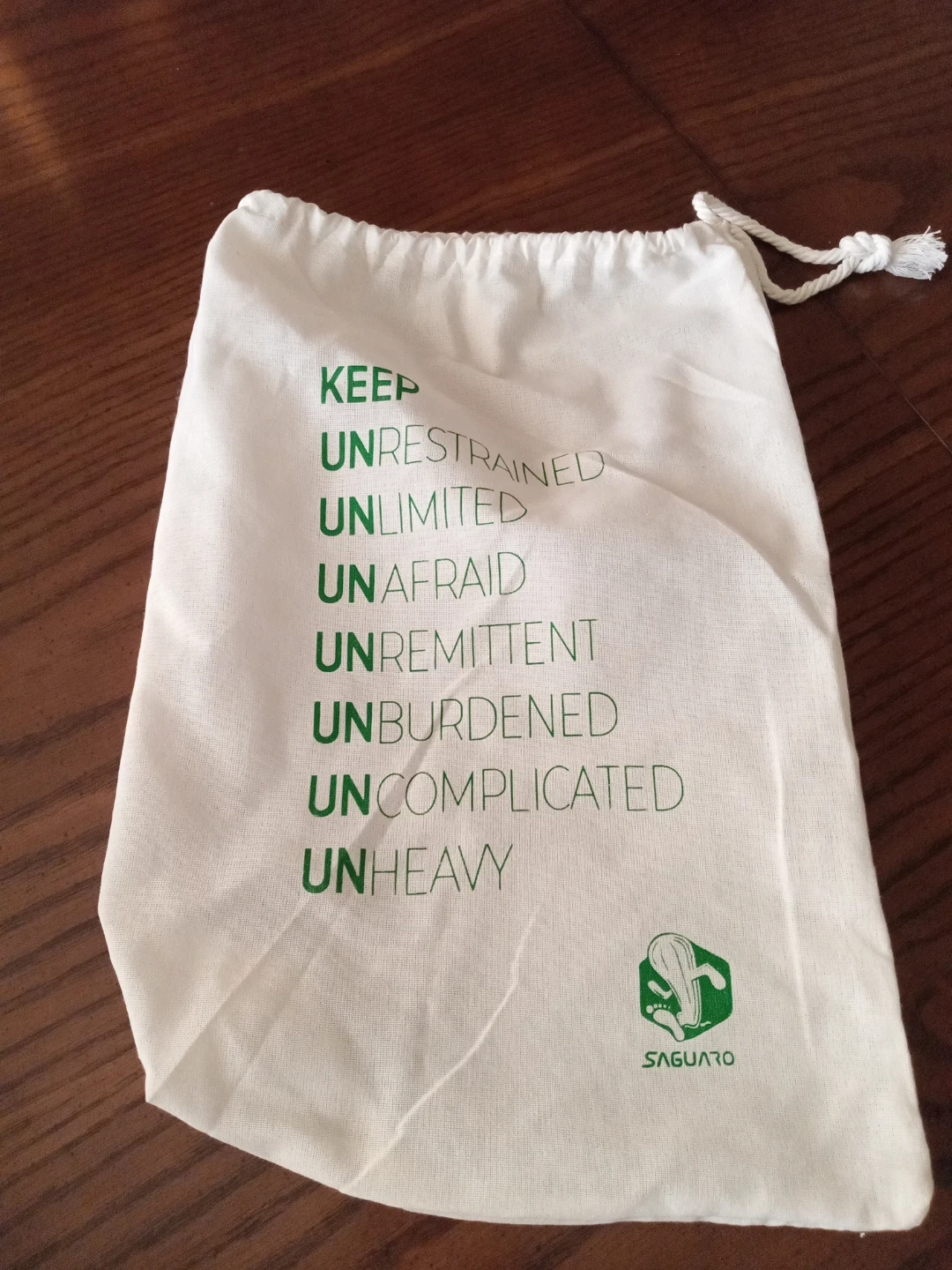 This Saguaro drawstring bag is made of cotton. It's white with green text and a green logo. The bag has a quote that says 'KEEP UNRESTRAINED UNLIMITED UNAFRAID UNREMITTENT UNBURDENED UNCOMPLICATED UNHEAVY'. This bag would be useful for travel or everyday storage.