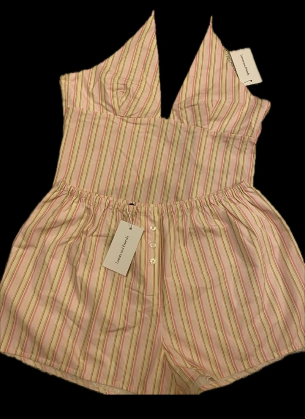 Sweet pink and yellow striped pajama set from Lovers and Friends. It features adjustable spaghetti straps and button detailing on the shorts. Soft cotton material for comfy nights!