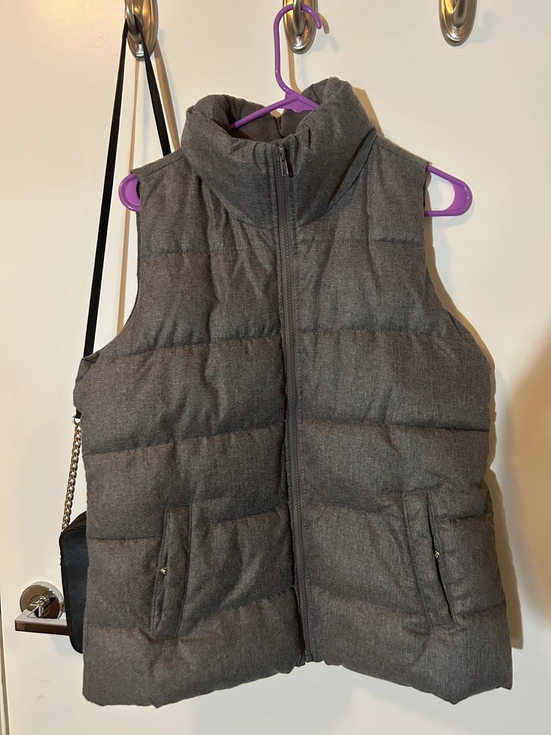 Selling a gently used Old Navy puffer vest in a neutral grey colour! It's a size small and in great condition.