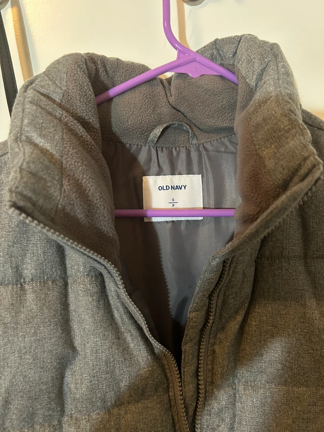 Selling a gently used Old Navy puffer vest in a neutral grey colour! It's a size small and in great condition.