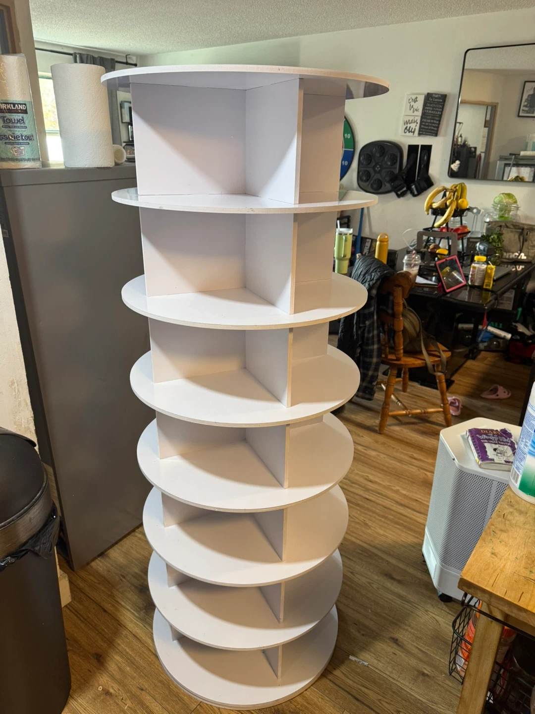 Selling a white round rotating shoe rack! It's perfect for organizing your shoes and saving space. It's in great condition and ready for a new home. Would be great for displaying other items as well!