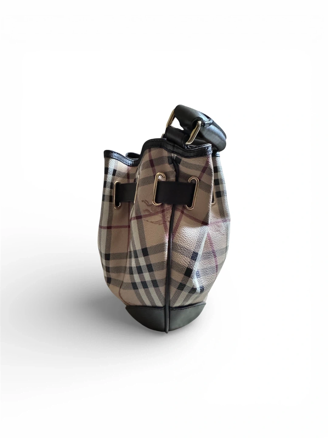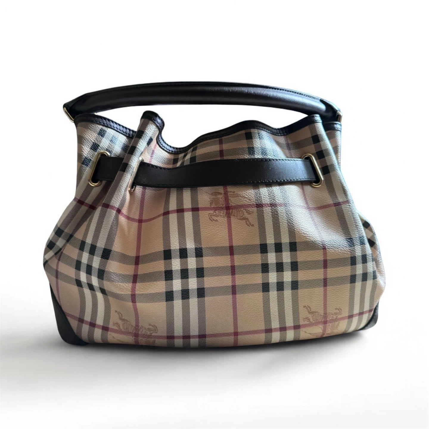 A classic Burberry handbag. It has a brown leather handle and trim with a gold clasp closure. The bag is a traditional Burberry check pattern with a horse and rider emblem. It has a brown leather bottom and a detachable shoulder strap. The bag is perfect for carrying your essentials around town.