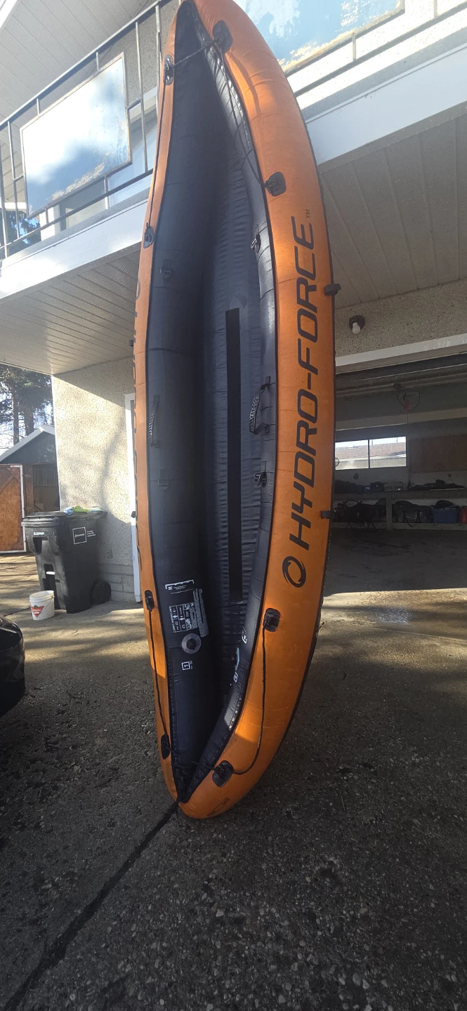 This is an orange and black Hydro-Force inflatable kayak. It's made from durable materials and comes with grab handles. It's great for recreational use on calm waters. You can easily inflate and deflate it for transport and storage.