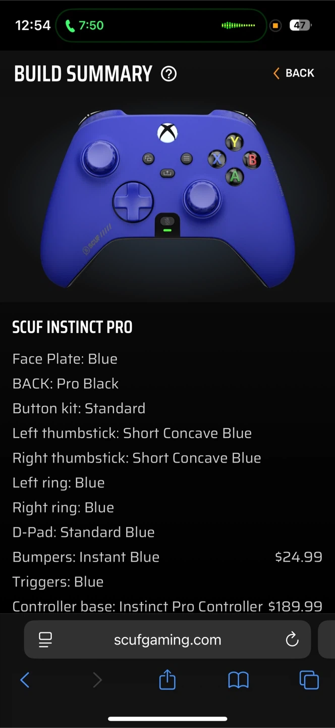 18Selling a SCUF Instinct Pro controller for Xbox in blue. It's in great condition and comes with the original box. Here are some details: - Face Plate: Blue - Back: Pro Black - Button kit: Standard - Left thumbstick: Short Concave Blue - Right thumbstick: Short Concave Blue - Left ring: Blue - Right ring: Blue - D-Pad: Standard Blue - Bumpers: Instant Blue - Triggers: Blue Originally, the controller base was $189.99 USD and the bumpers were $24.99. USD