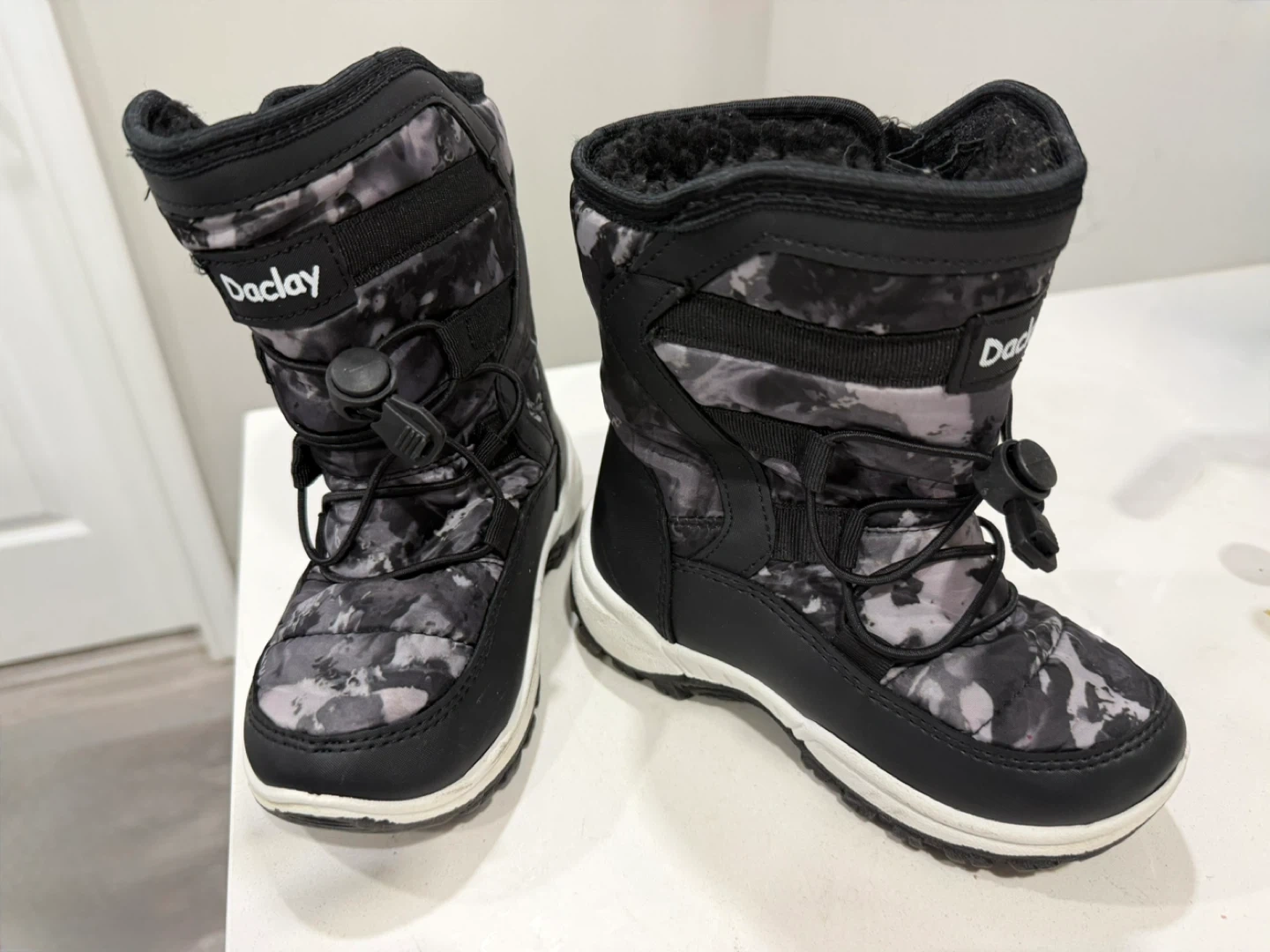 These Daclay snow boots are perfect for keeping little feet warm and dry! They feature a stylish black and grey camo pattern and a convenient toggle closure for easy on and off. Great condition!