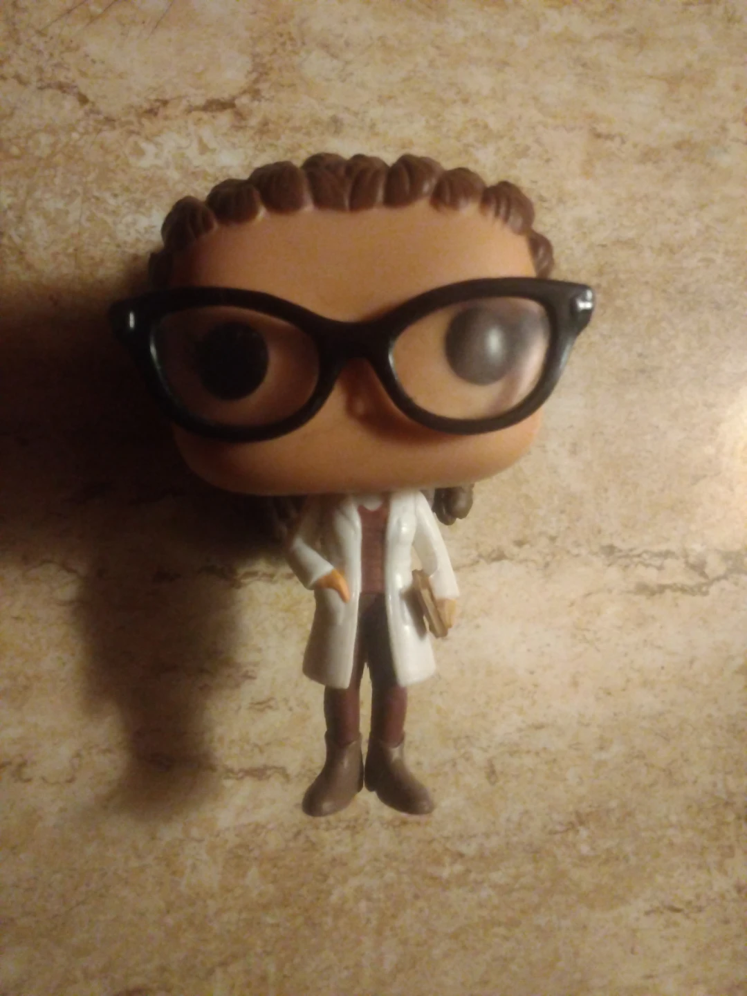 This is a Funko Pop! figure of a scientist. It features a white lab coat, glasses, and brown hair. The figure includes a small book accessory.
