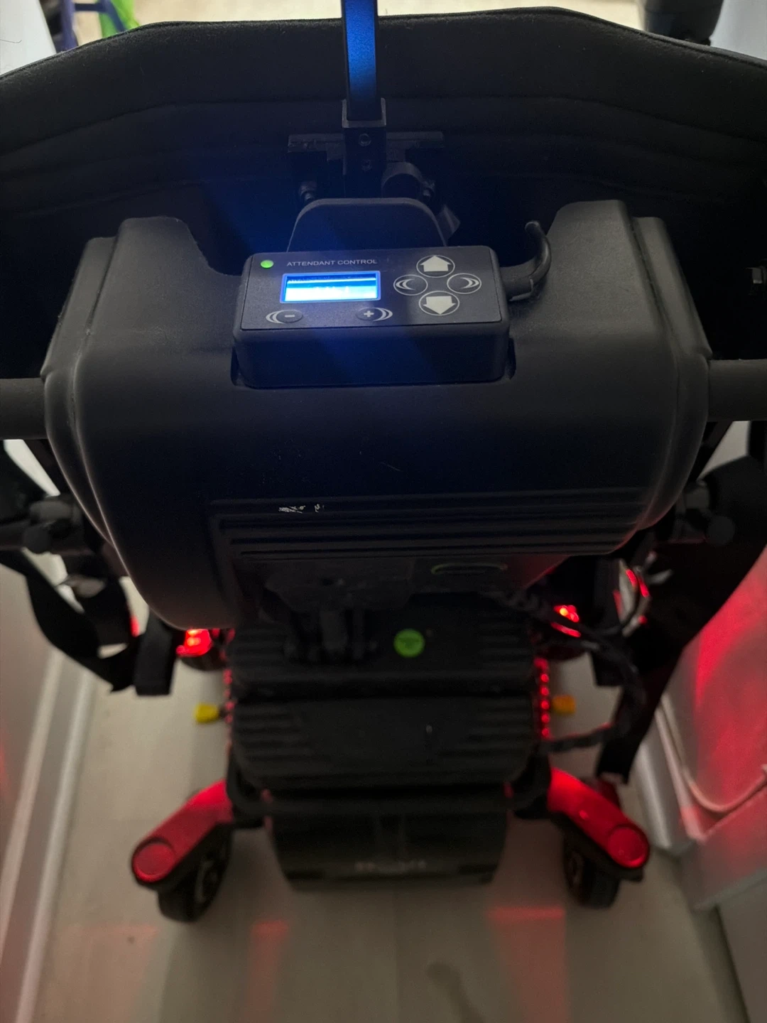 ROVI X3 power wheelchair with attendant control. Black upholstery. Features a joystick for operation and rear lights.