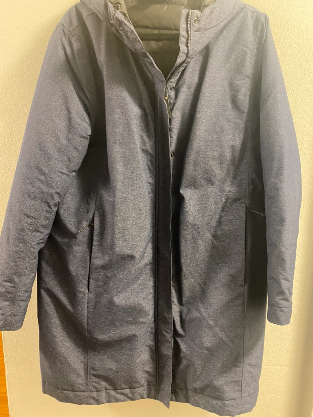 Lole hooded parka jacket in a dark blue heathered fabric. It's lightweight and has a full zip closure. Great for transitional weather!