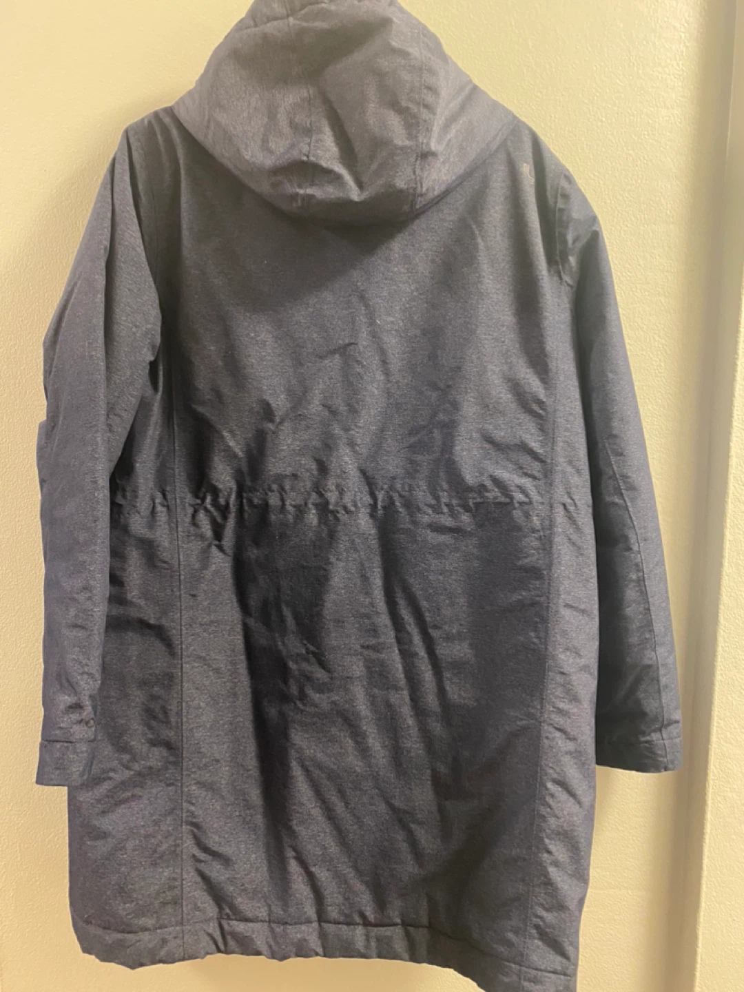 Lole hooded parka jacket in a dark blue heathered fabric. It's lightweight and has a full zip closure. Great for transitional weather!