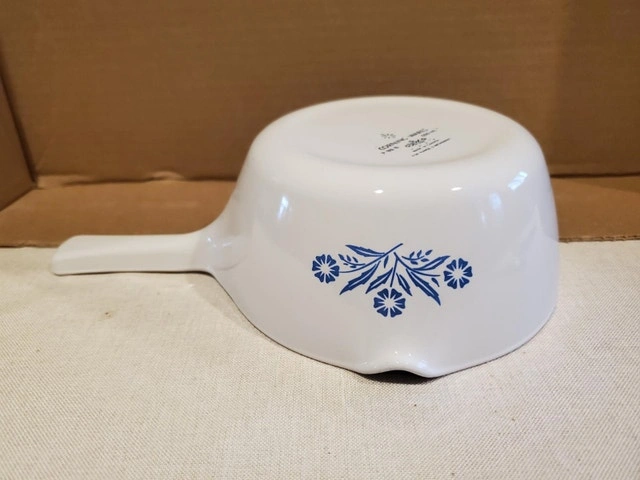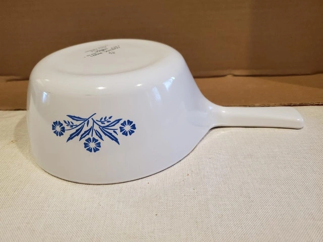 Vintage Corning Ware pot with pouring spout. It's in the Blue Cornflower pattern. It's small - about 9.25" long including the handle, holds 650 ml. It's marked Corning Ware Made in Canada and it's model number P-89-B. Asking $15.00, pick up only.
