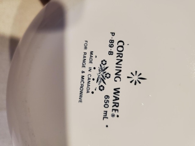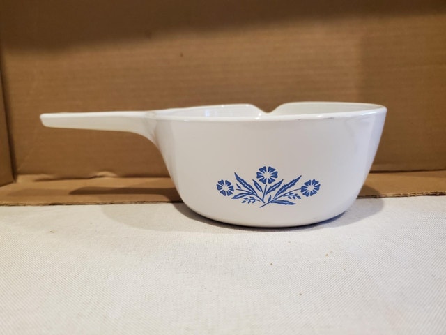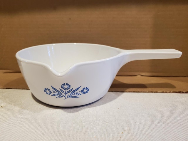 Vintage Corning Ware pot with pouring spout. It's in the Blue Cornflower pattern. It's small - about 9.25" long including the handle, holds 650 ml. It's marked Corning Ware Made in Canada and it's model number P-89-B. Asking $15.00, pick up only.