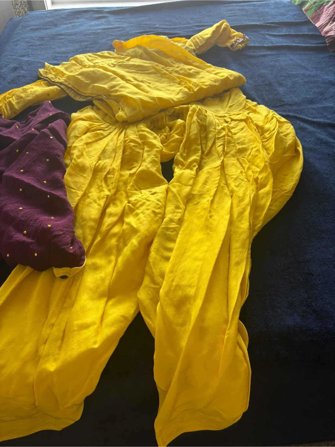 Selling a traditional Salwar Kameez suit. It's a beautiful yellow colour with maroon detailing. Perfect for a special occasion or cultural event!