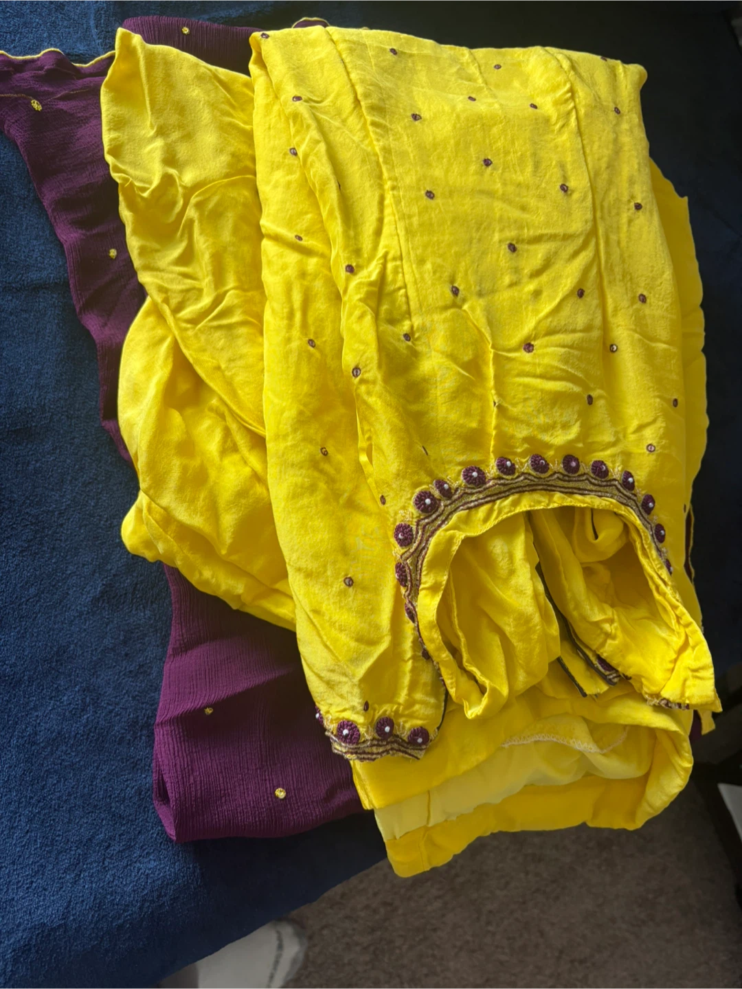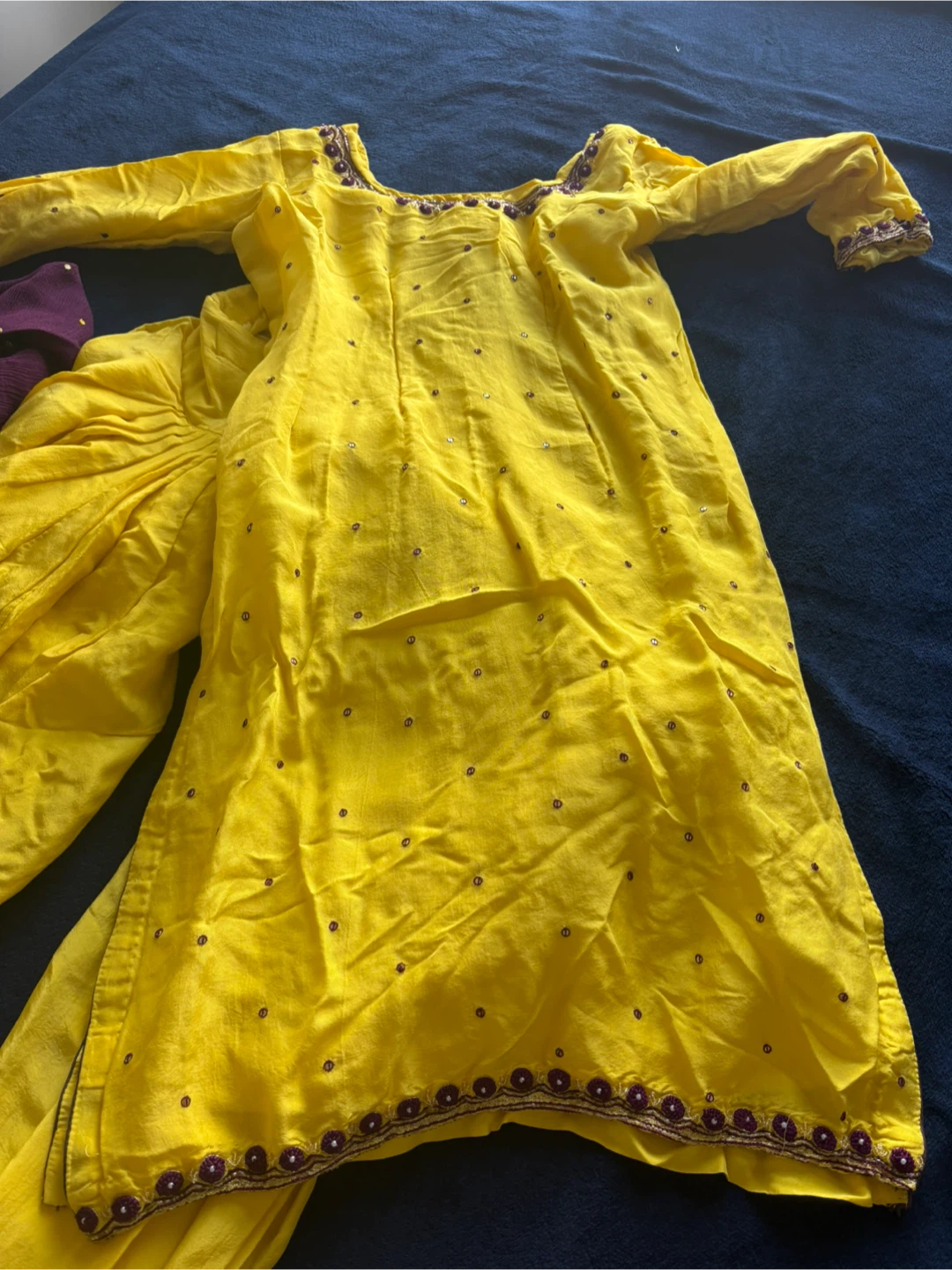 Selling a traditional Salwar Kameez suit. It's a beautiful yellow colour with maroon detailing. Perfect for a special occasion or cultural event!