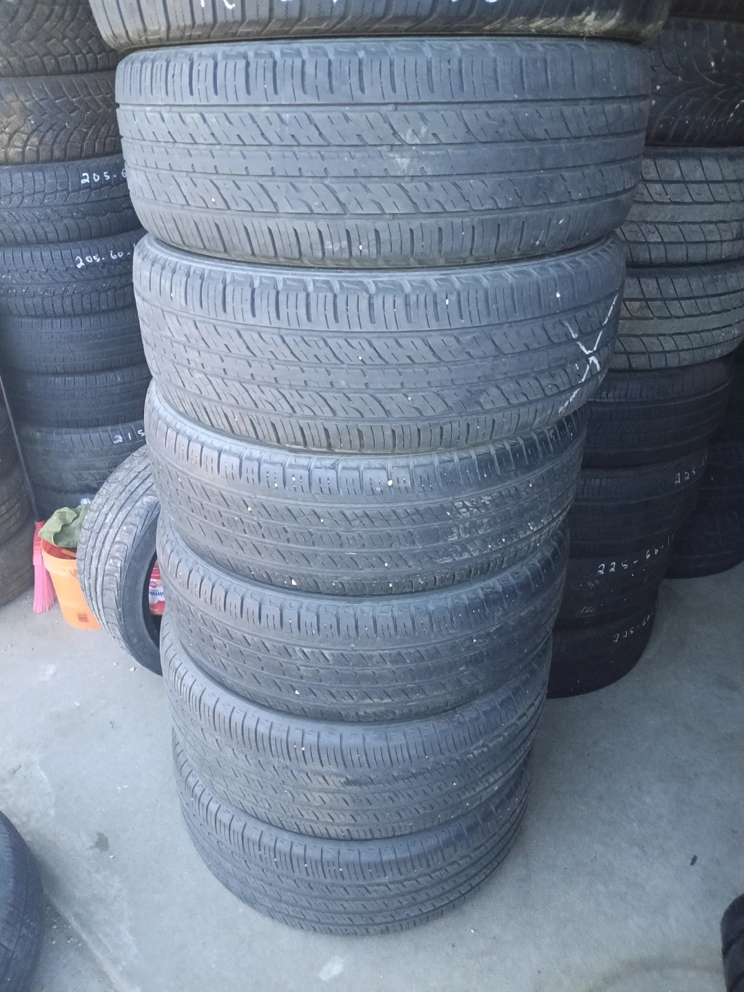 A stack of used tires ready for a new life. Various sizes are visible, including some marked with 265-55-18. These tires are suitable for a range of vehicles. They're ready for pickup!