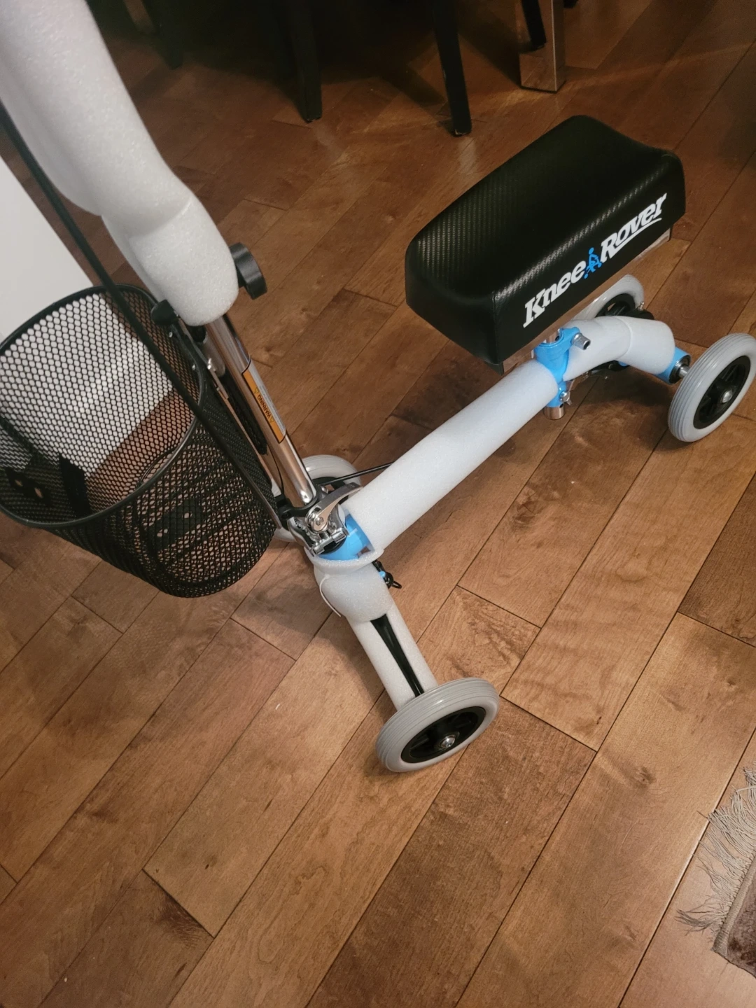 This Knee Rover steerable knee scooter walker provides mobility assistance. It features a padded seat and a basket for storage. Its steerable design makes it easy to manoeuvre.
