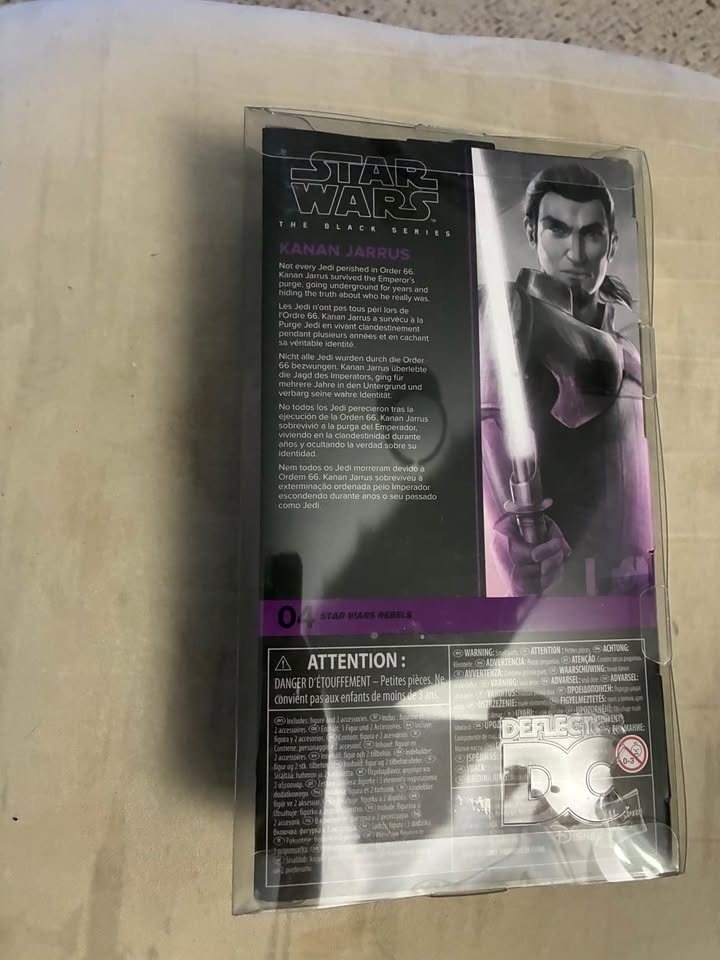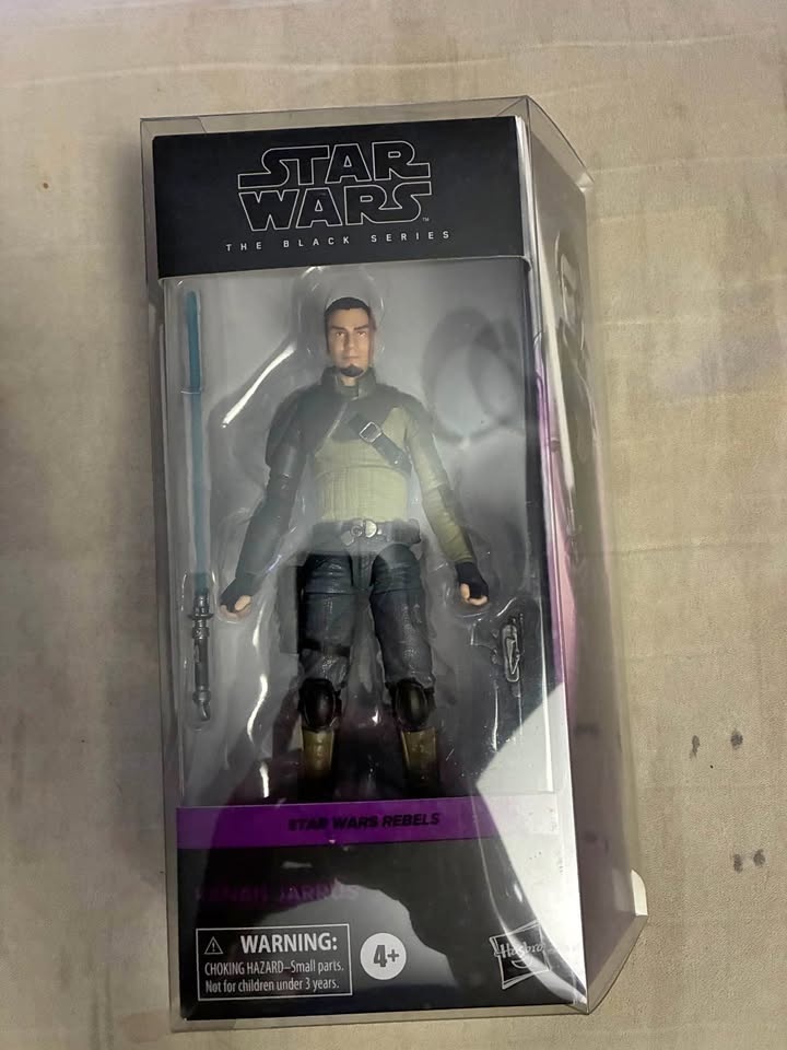 This is a 6-inch scale Kanan Jarrus action figure from the Star Wars Rebels line. Kanan Jarrus was a Jedi Padawan who survived Order 66 and became a leader in the rebellion. The figure comes with a blaster and a lightsaber with a removable blue blade. As part of the Black Series line, this figure is highly detailed and articulated for posing. Selling online for over $100.