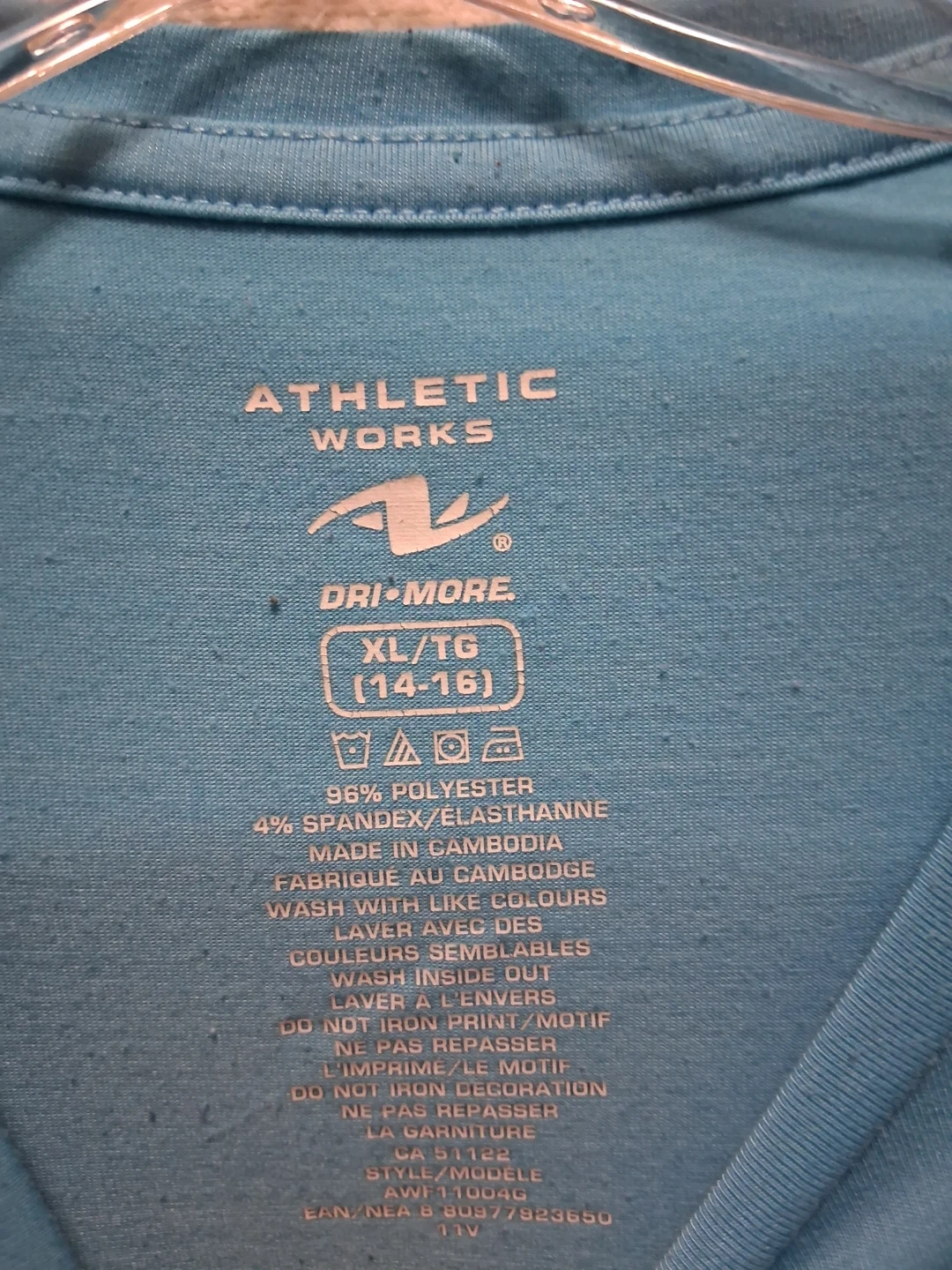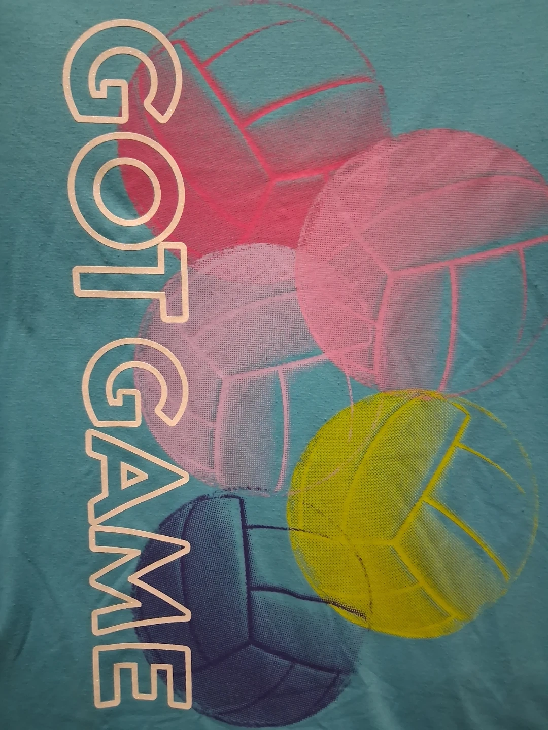 Blue long sleeve shirt with "Got Game" and volleyball graphic. Made with 96% polyester and 4% spandex/elastane. Size XL/TG (14-16).