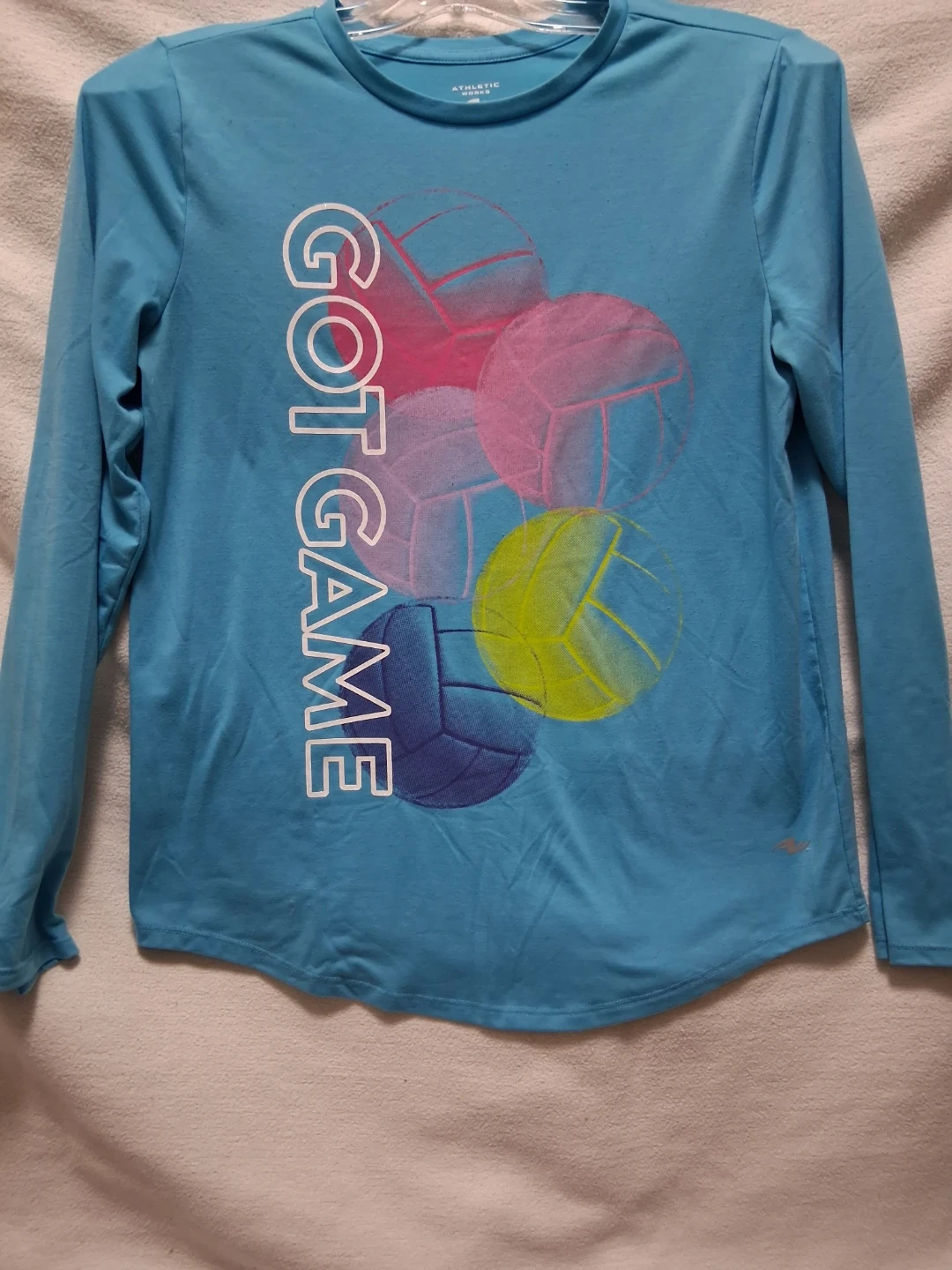 Blue long sleeve shirt with "Got Game" and volleyball graphic. Made with 96% polyester and 4% spandex/elastane. Size XL/TG (14-16).