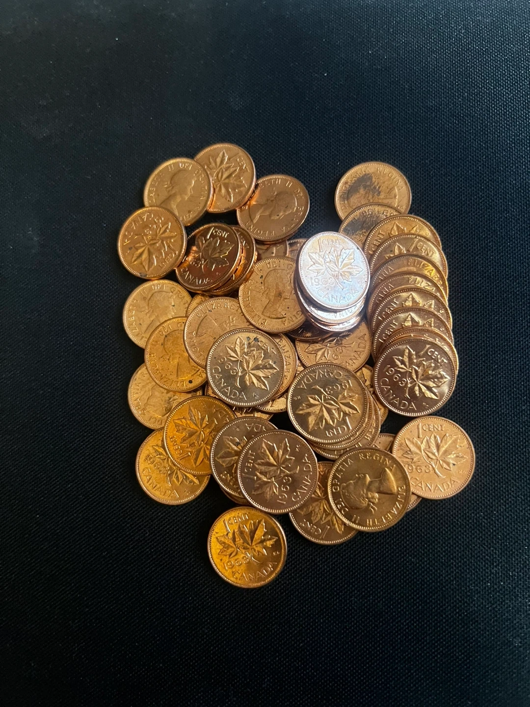 Collection of Canadian 1 cent coins, often called pennies. Most visible coins are dated 1963, featuring Queen Elizabeth II on one side and a maple leaf on the other. These are copper-coloured coins.