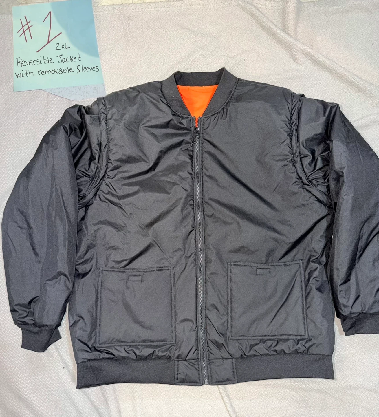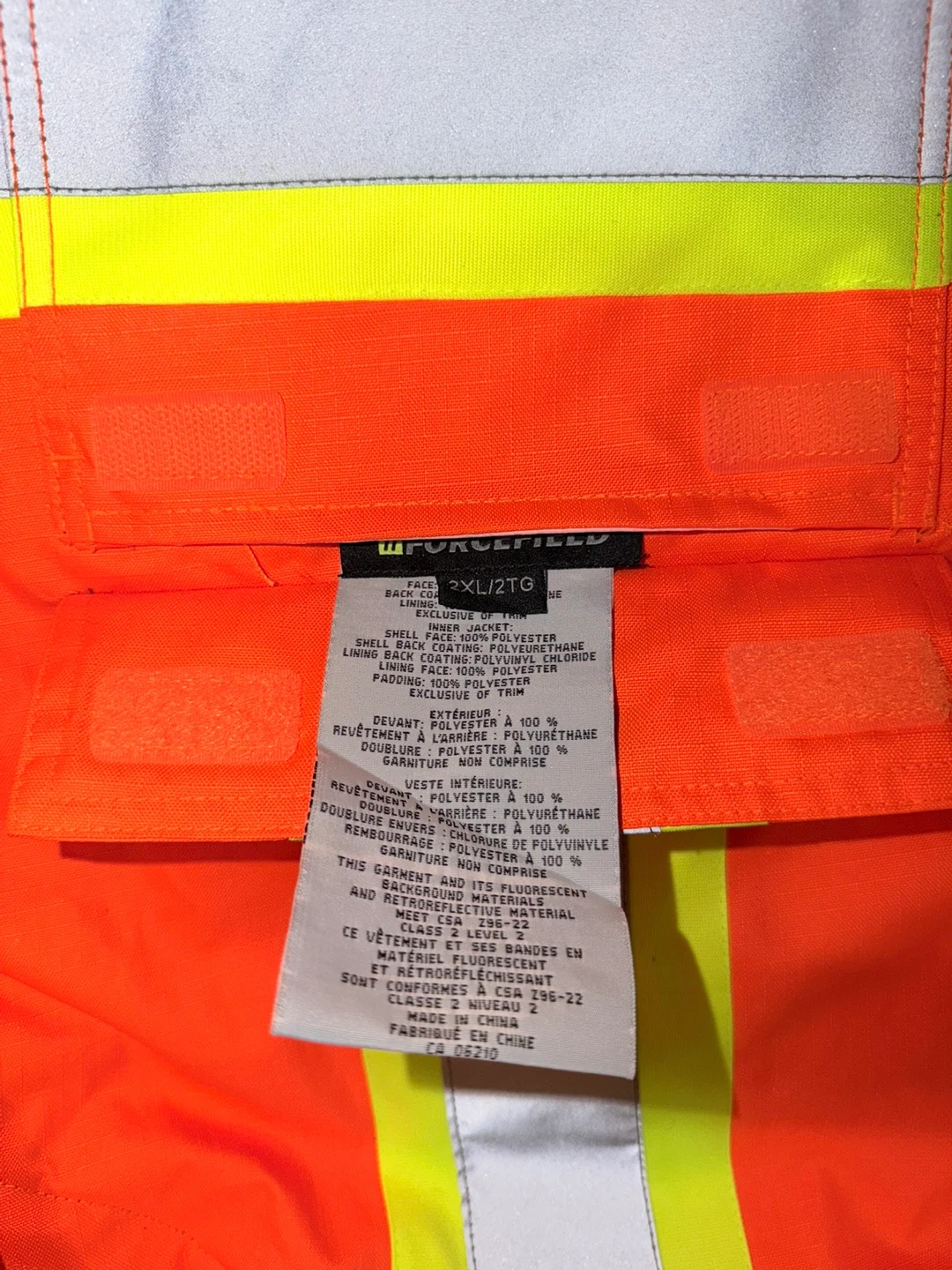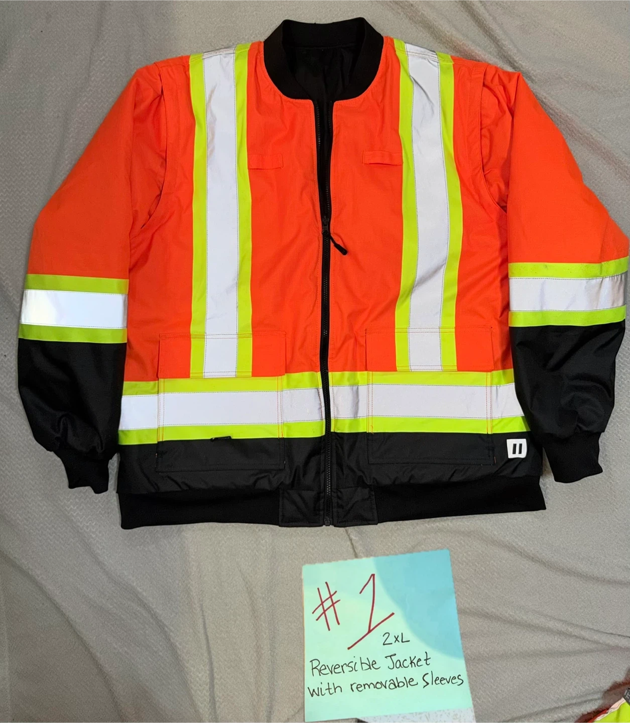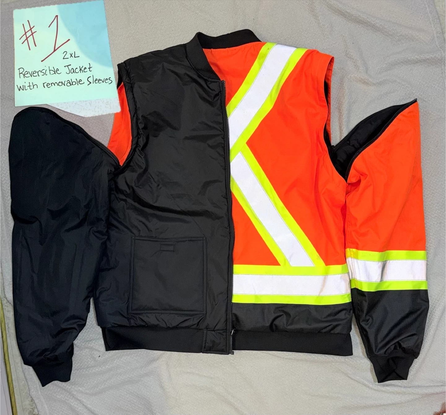 This jacket is reversible with removable sleeves and features a fluorescent material. It's made of 100% polyester with a polyurethane coating. It's a Class 2 Level 3 garment.