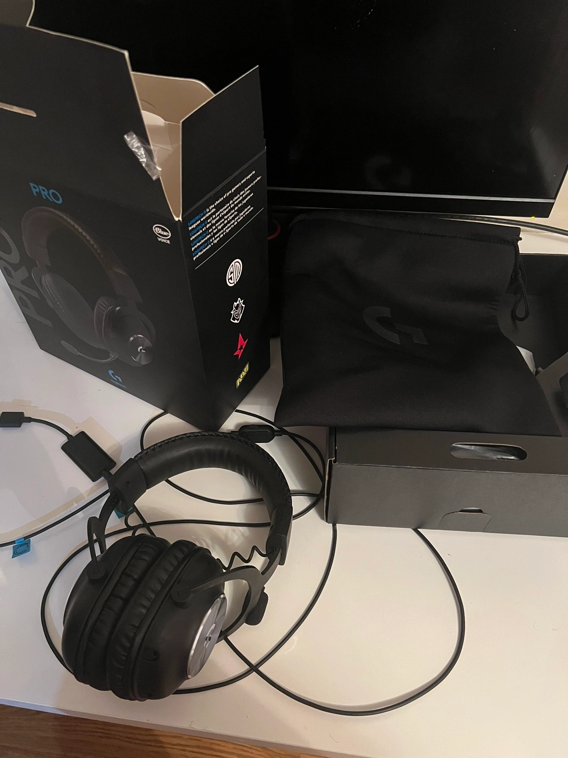 Logitech G Pro X Gaming Headset. Includes detachable microphone, carrying case, USB sound card, 3.5mm cable, and original packaging.