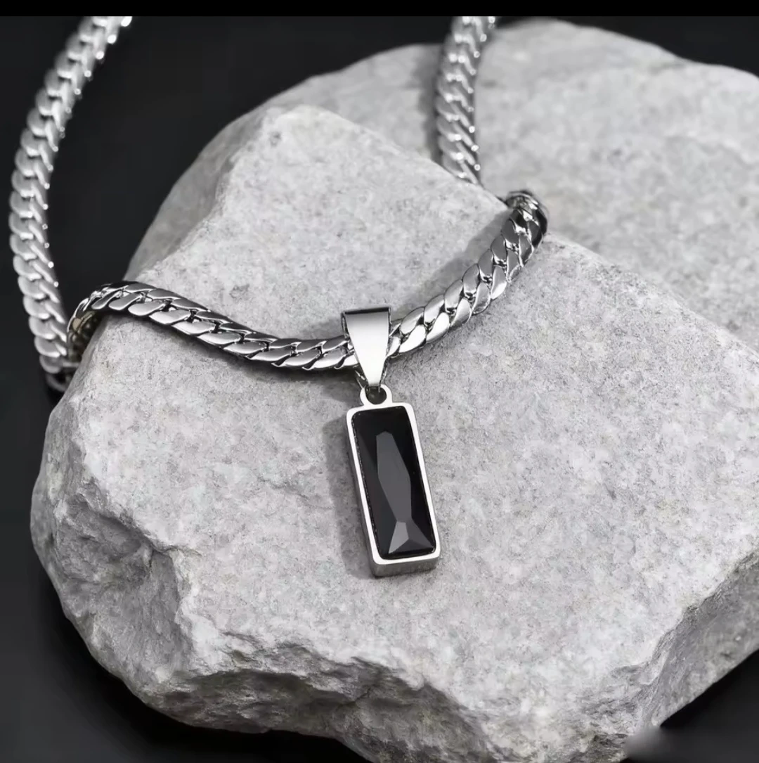 Selling a stylish men's silver chain necklace with a rectangular black stone pendant. The chain is a sturdy curb link style. Adds a touch of class to any outfit!
