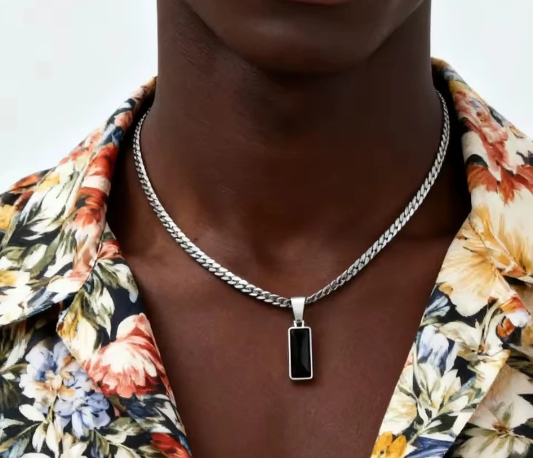 Selling a stylish men's silver chain necklace with a rectangular black stone pendant. The chain is a sturdy curb link style. Adds a touch of class to any outfit!