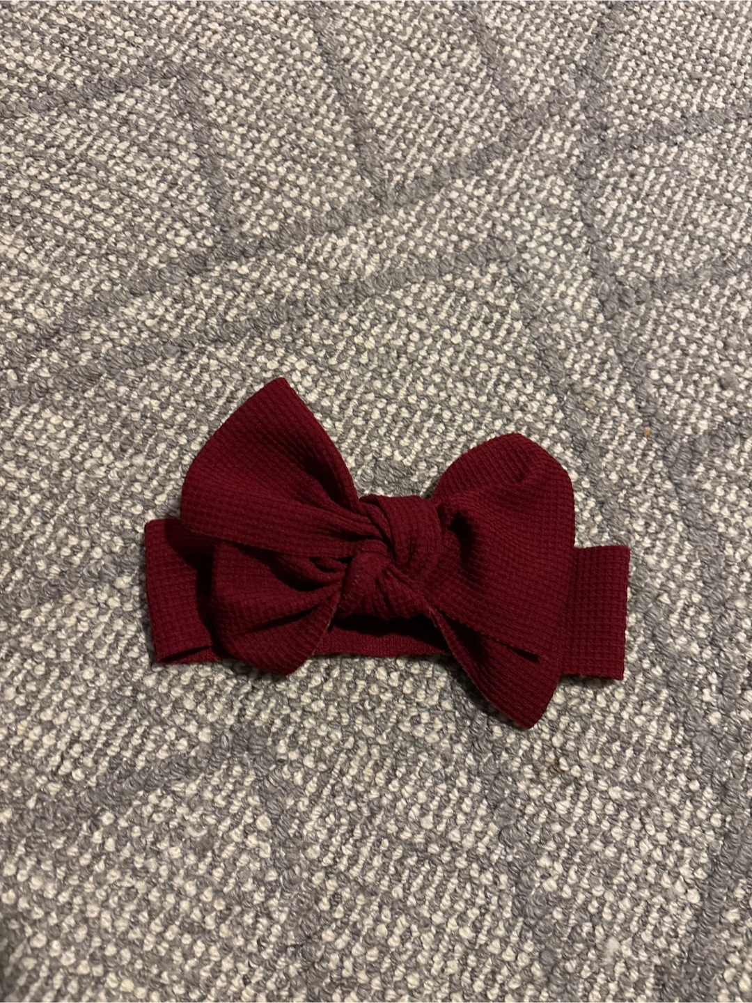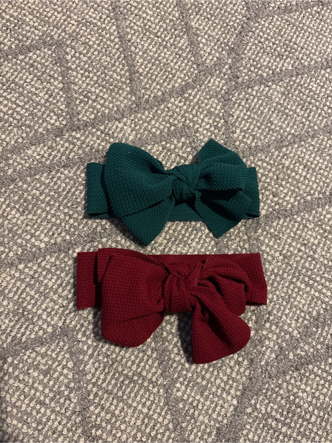 This set includes two soft and stretchy baby headbands, one in a deep green and the other in a rich burgundy. Both feature a cute knotted bow detail. They're perfect for accessorizing your little one's outfits.