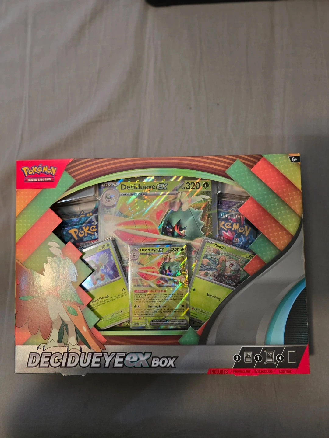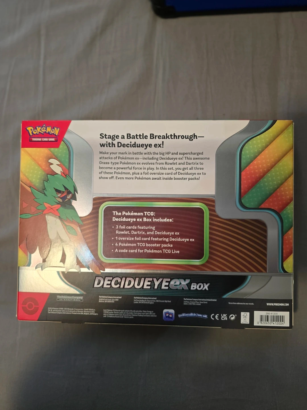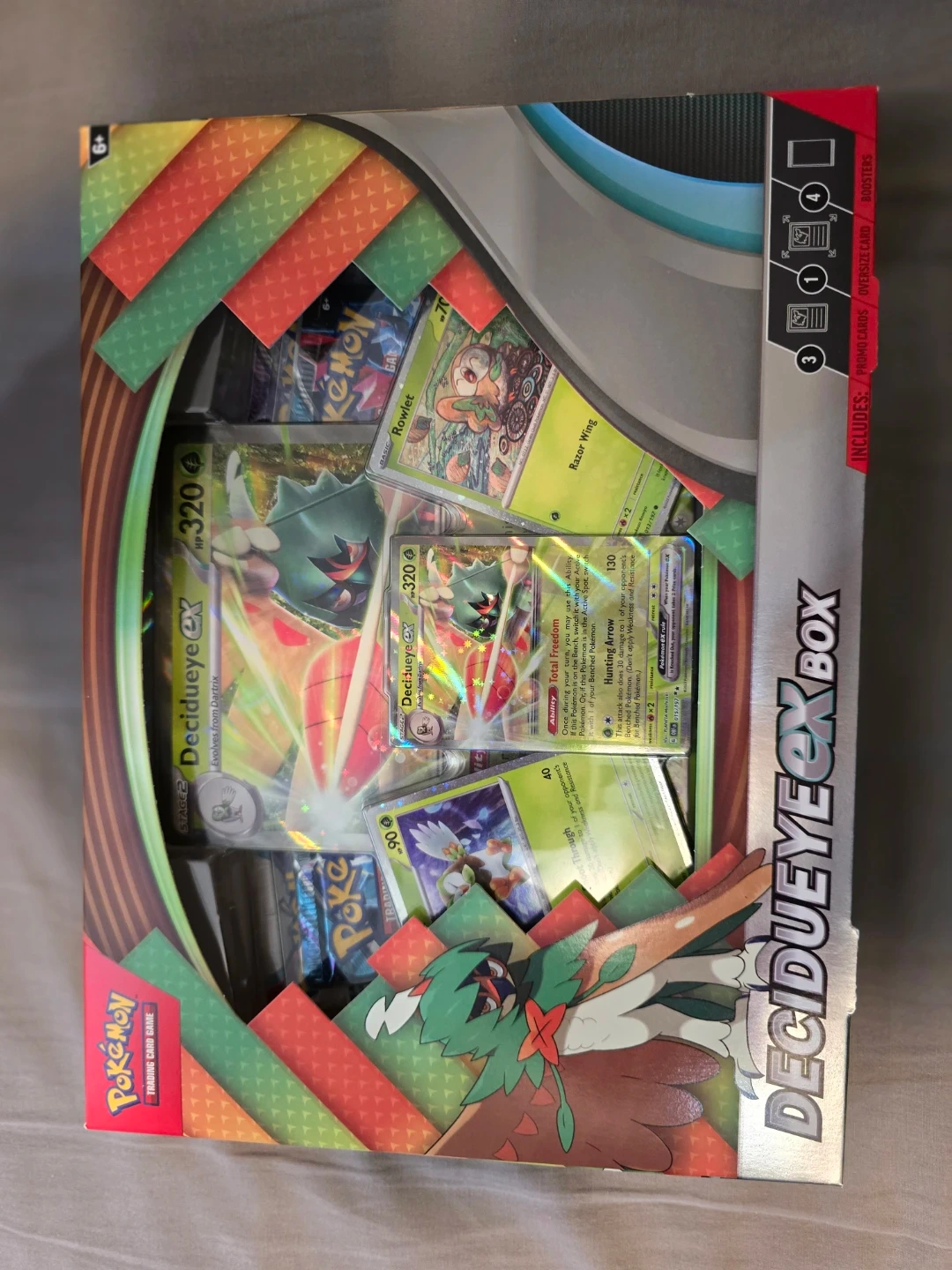 This Pokémon TCG box includes Decidueye ex! It comes with 3 foil cards featuring Rowlet, Dartrix, and Decidueye ex, plus a full-size oversized Decidueye ex card. You'll also find 4 Pokémon TCG booster packs and a code card for Pokémon TCG Live. Get ready to stage a battle breakthrough with this powerful set!