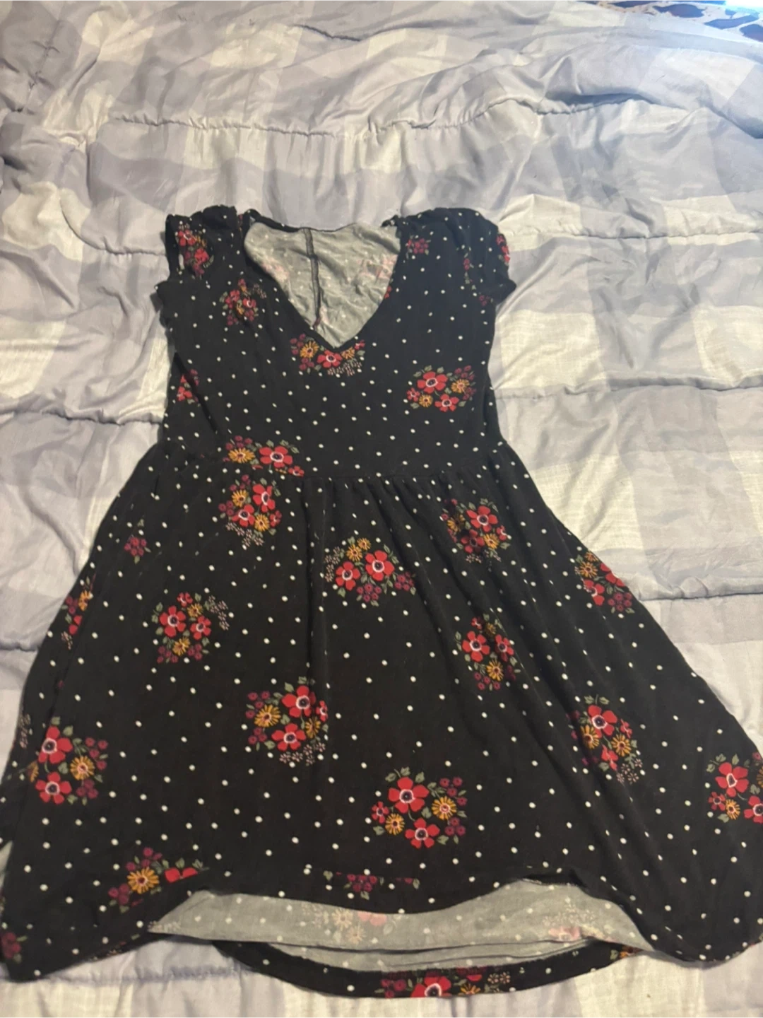 This women's dress features a black base with a white polka dot and colourful floral print. It has short sleeves and a V-neckline. Material is a soft, stretchy blend. This dress is great for casual wear or dressing up for warmer weather!