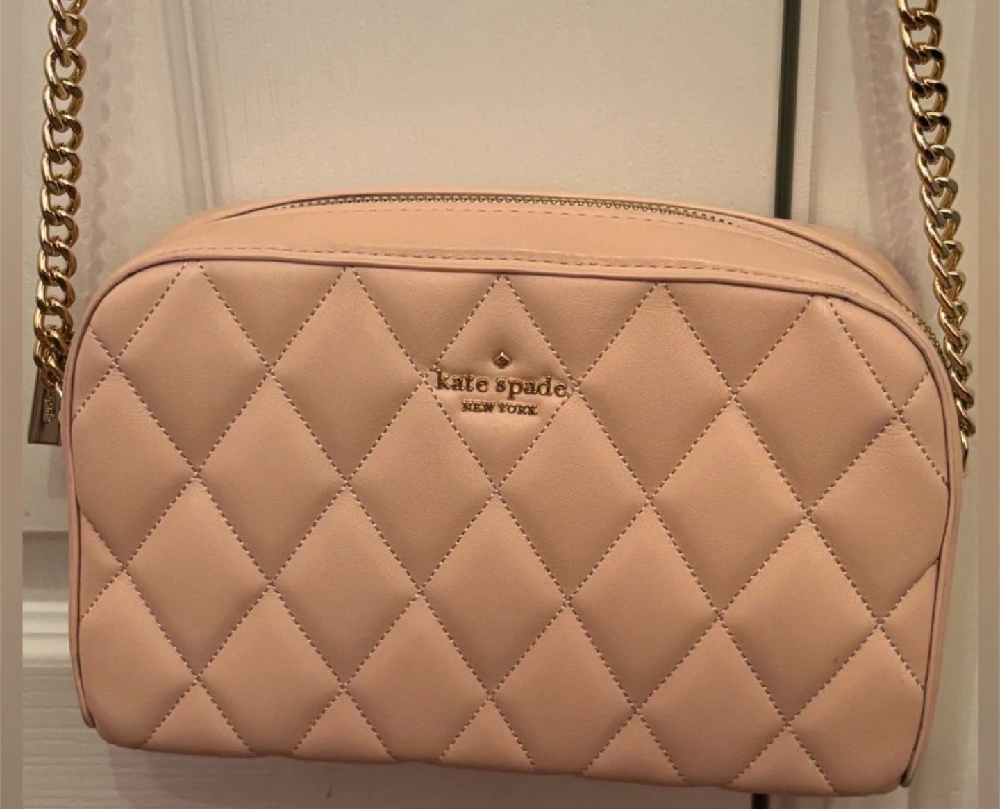 This is a pink quilted leather camera bag by Kate Spade. It has a secure zip closure and a stylish gold chain strap. A great bag for carrying your essentials! Bought and paid in The United States