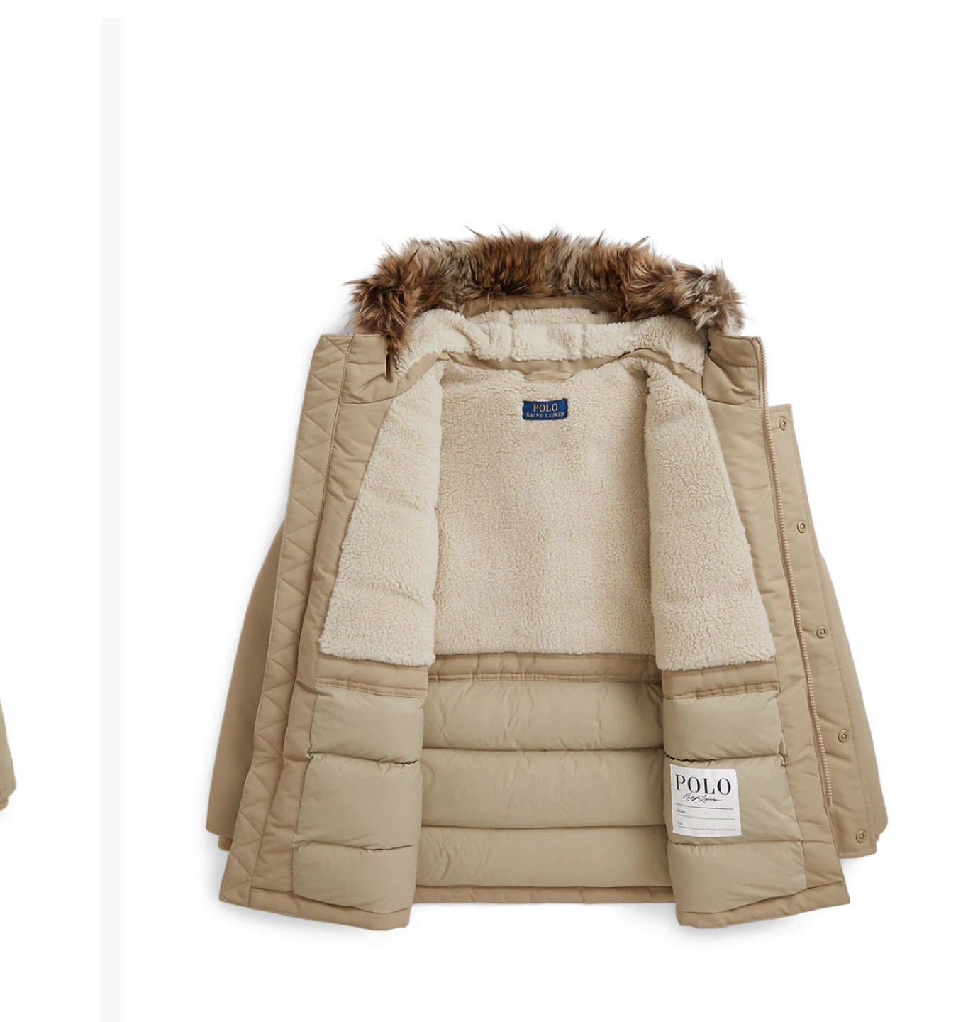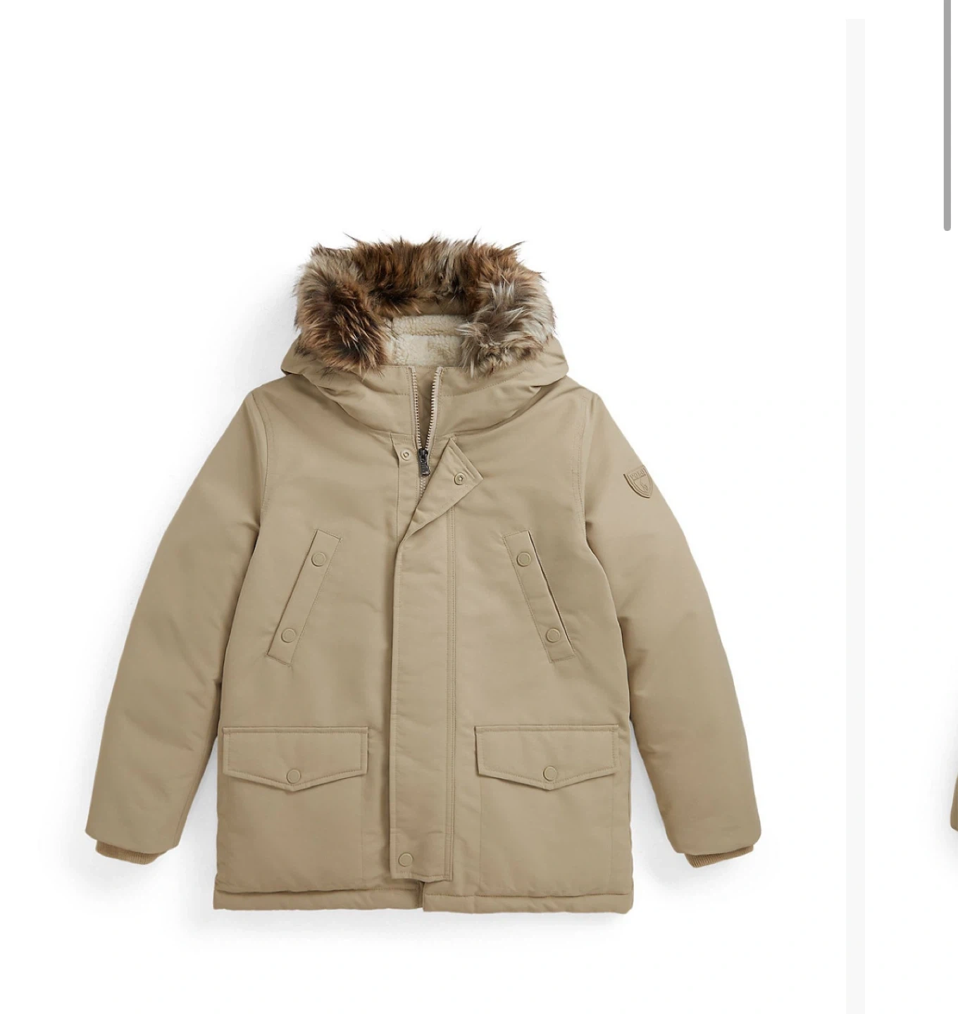 This Polo Ralph Lauren parka jacket is designed for warmth and style. It features a tan exterior with a cozy sherpa-lined interior and a faux fur-trimmed hood. It's perfect for keeping kids comfortable during colder weather!