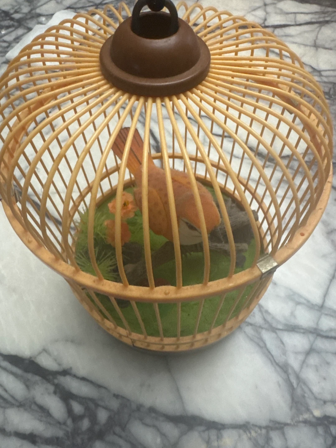 This is a fun little mechanical bird that chirps and sings when activated. It's housed in a decorative cage with a perch and artificial greenery. A unique piece for decor or as a playful gadget!