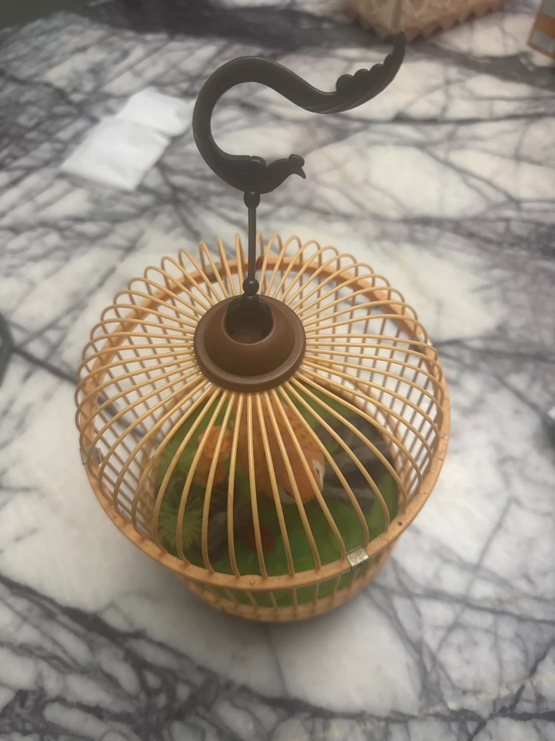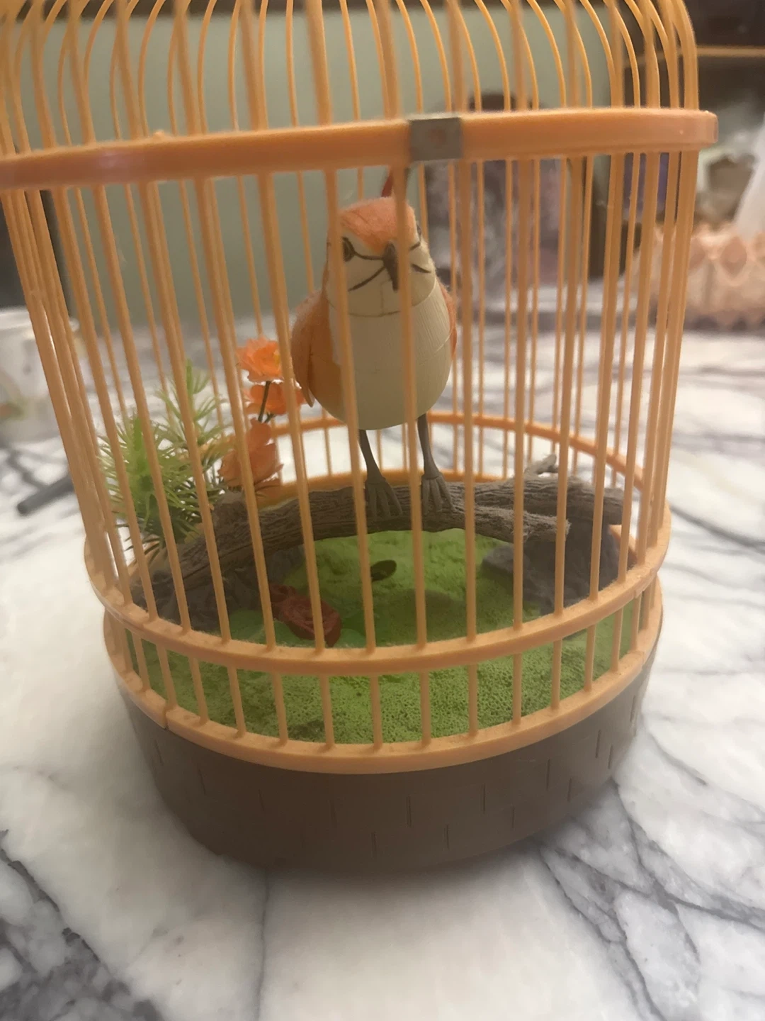 This is a fun little mechanical bird that chirps and sings when activated. It's housed in a decorative cage with a perch and artificial greenery. A unique piece for decor or as a playful gadget!