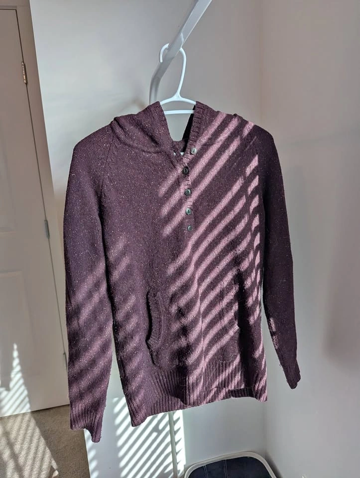 Size small Patagonia wool sweater. Pullover with hood and buttons, like a quarter zip. In good condition! I just don't reach for it much. Colour is purple with little speckles. Very cute! Asking $40 pickup near Langley Costco.