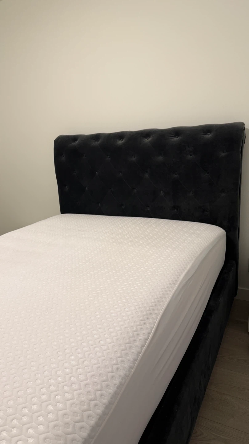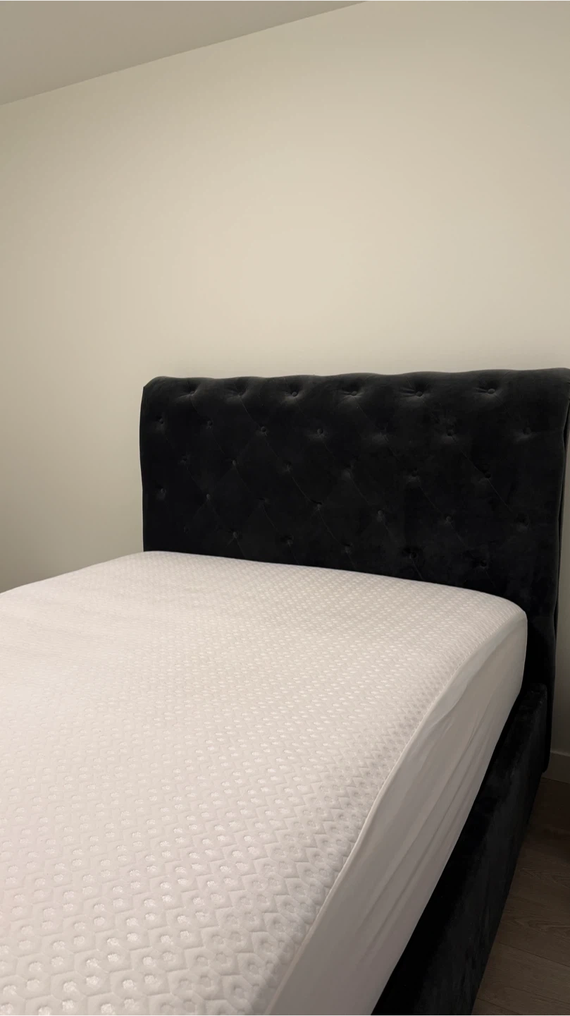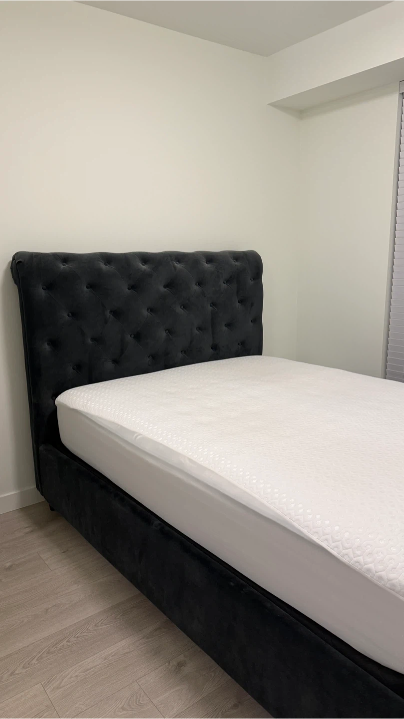 Selling a queen-sized bed frame with a stylish, tufted headboard. The bed frame is in great condition. Perfect for adding a touch of elegance to your bedroom!