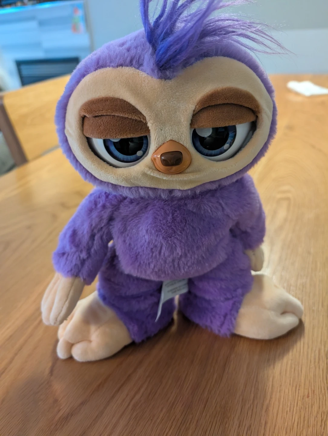 This is a fun, purple plush toy with sleepy eyes. It's soft and cuddly, perfect for playtime. Measures about 10 inches tall. Needs new batteries for movement but fully functional