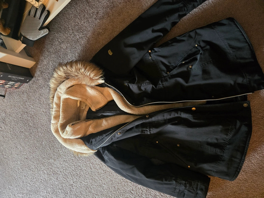 Black winter jacket with a fur hood. The jacket is lined with a warm, brown fleece material. It has a zipper closure and multiple pockets.