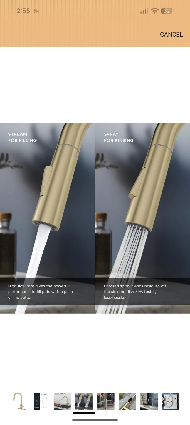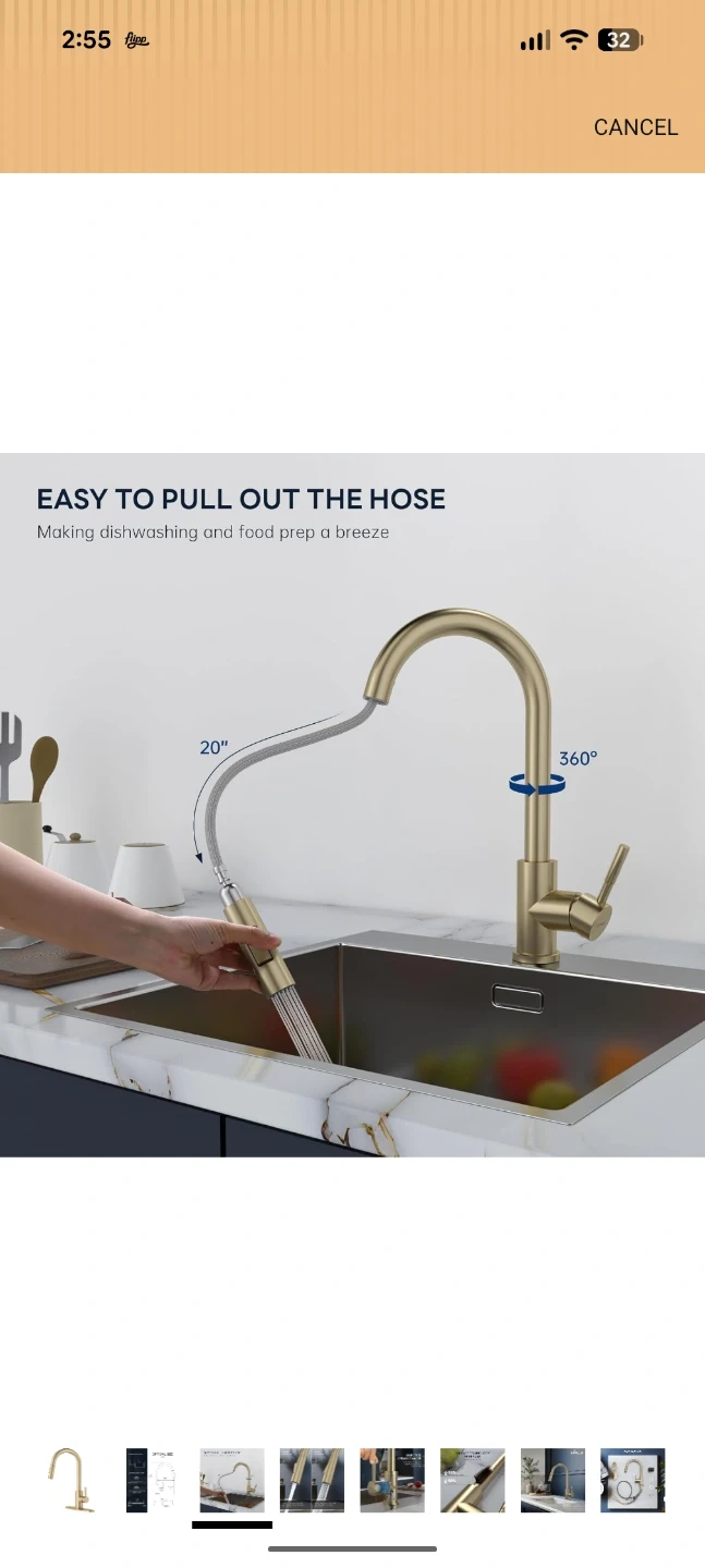 This APPASO kitchen faucet comes in a brushed gold finish. It features a pull-down sprayer with stream and spray modes for different tasks. The faucet includes the deck plate and all necessary hoses for installation.