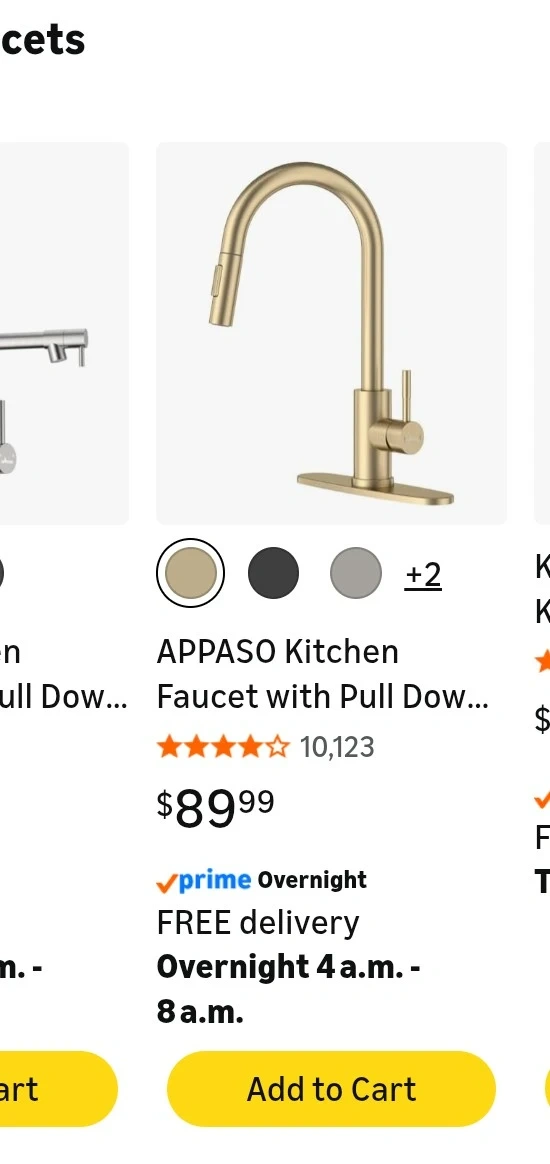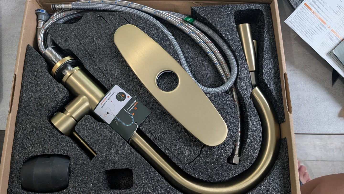 This APPASO kitchen faucet comes in a brushed gold finish. It features a pull-down sprayer with stream and spray modes for different tasks. The faucet includes the deck plate and all necessary hoses for installation.