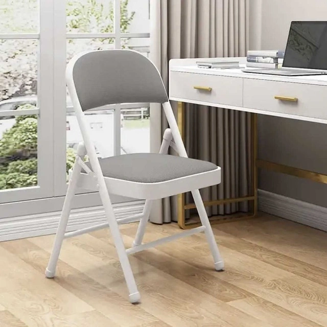 This folding chair features a sturdy white frame with a comfortable grey seat and back, perfect for small spaces or temporary seating. This chair is in good condition.