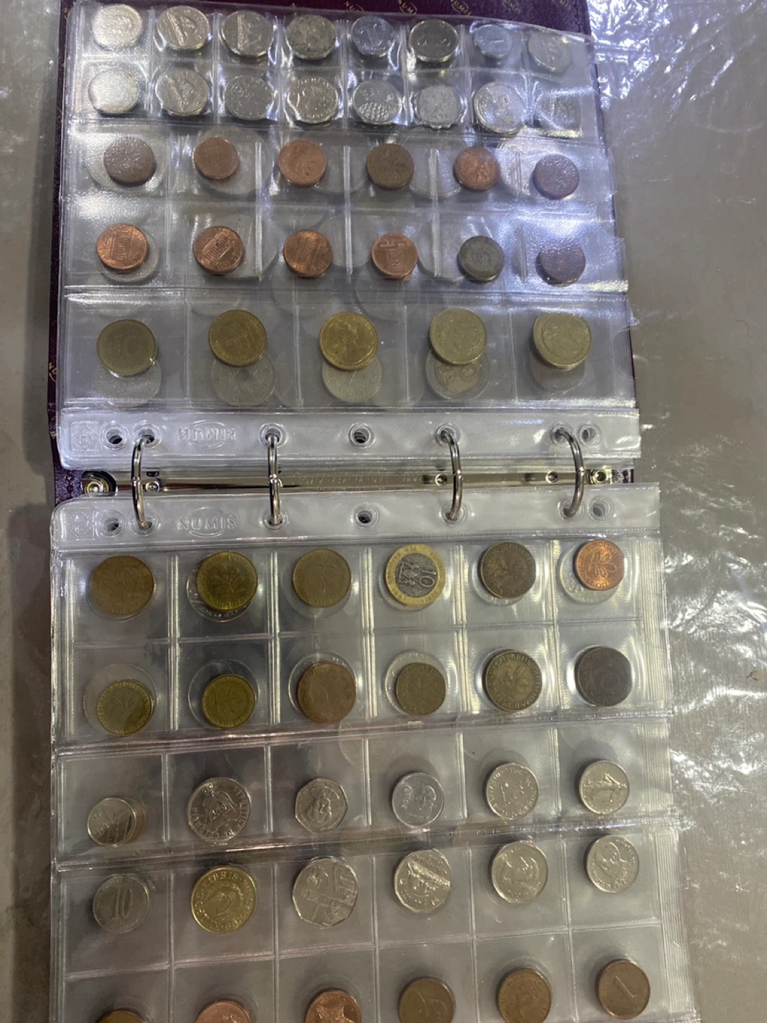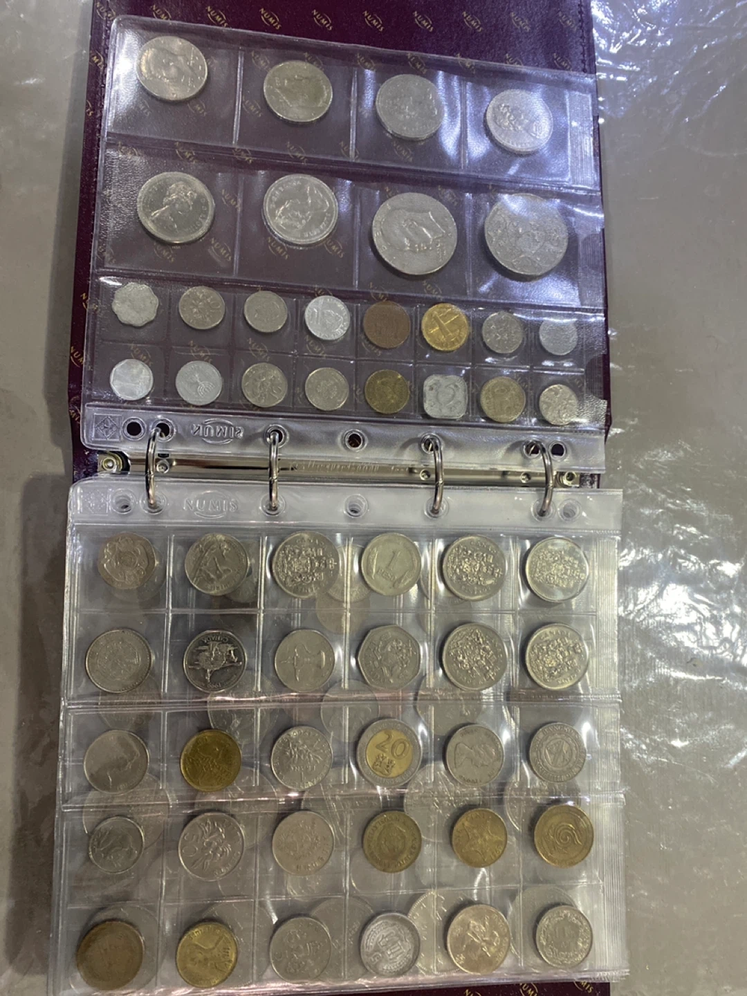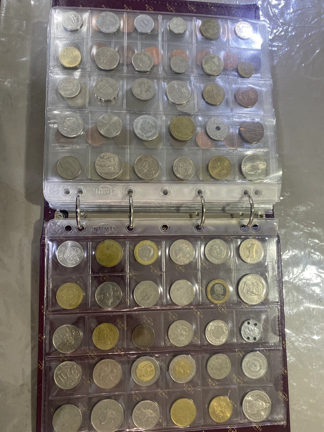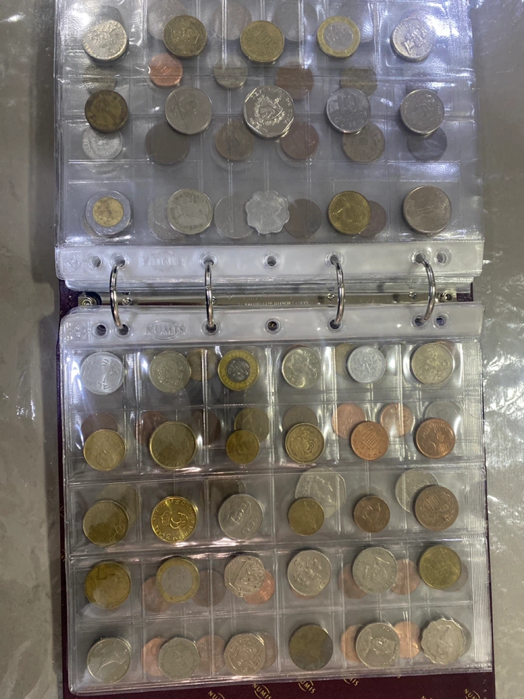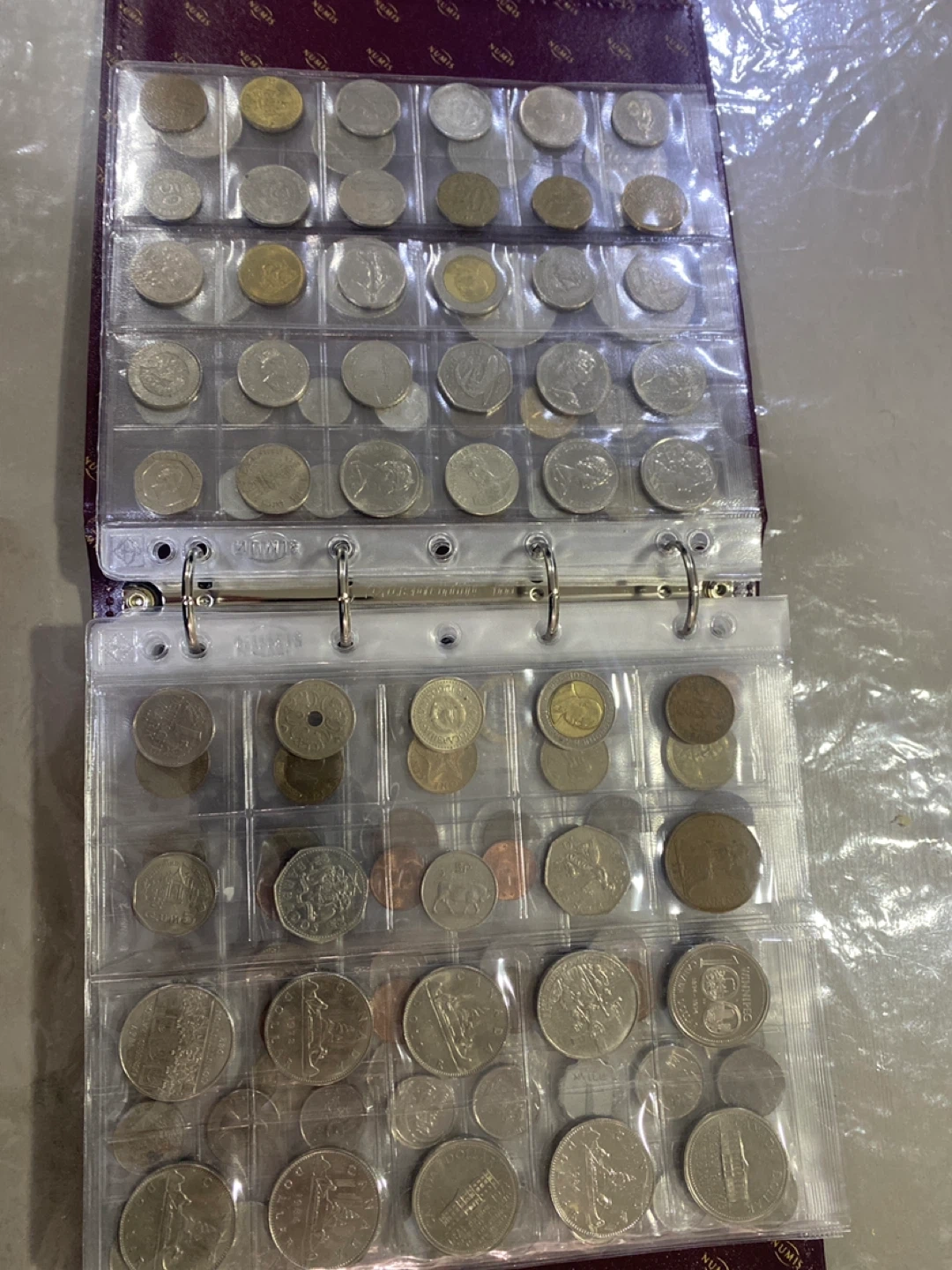 A collection binder filled with assorted coins from different countries and eras. It features multiple pages to display and organize your coins securely. This binder is perfect for coin collectors looking to expand or manage their collection.