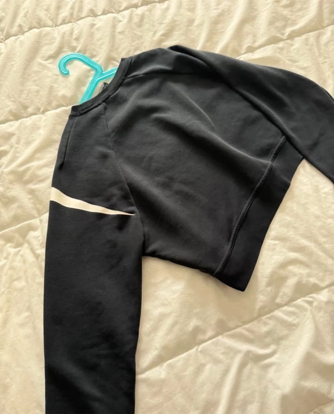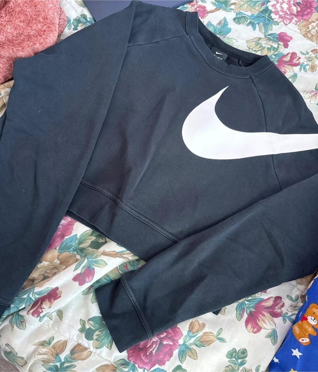 This is a black Nike Dri-FIT cropped sweatshirt with a large white swoosh. This sweatshirt would be great for casual wear or workouts.