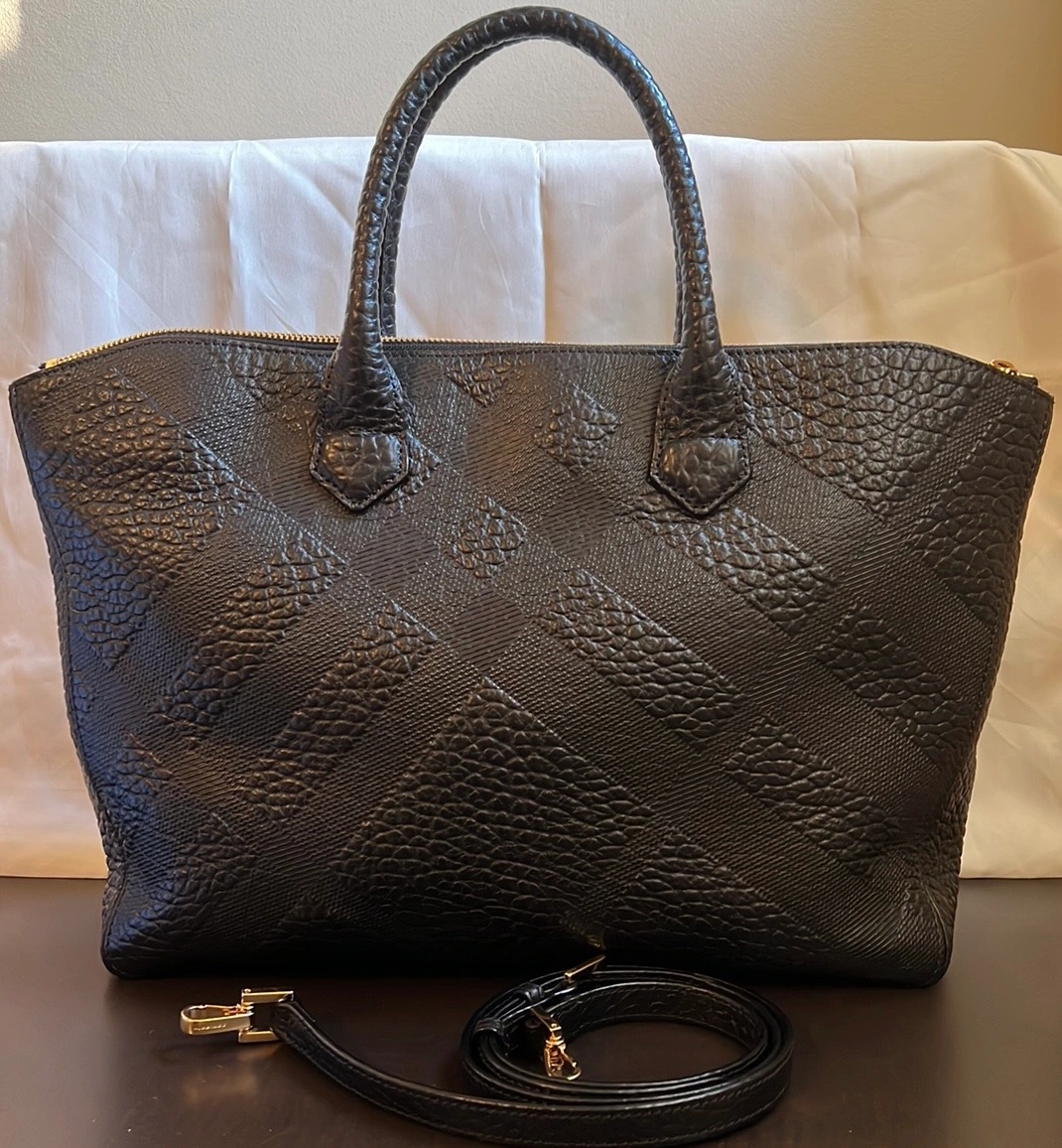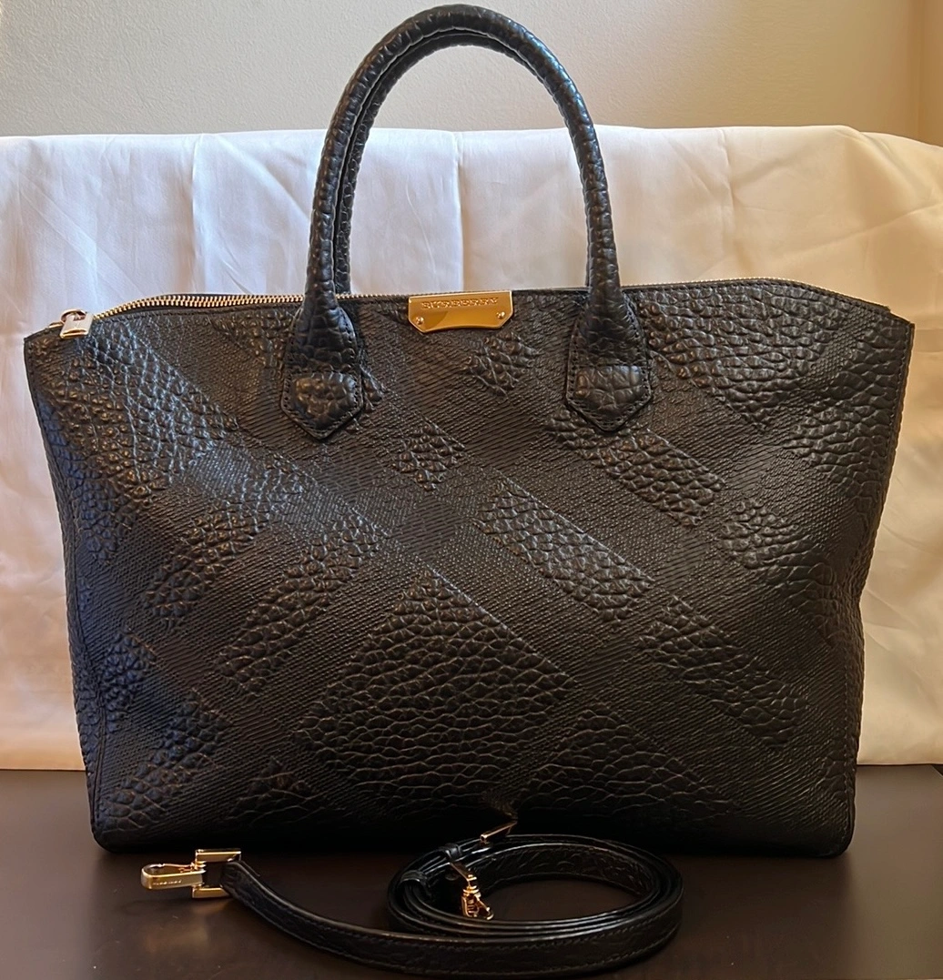 Black leather handbag with gold hardware. Features a top zip closure, double handles and a removable shoulder strap. The bag has an embossed design.