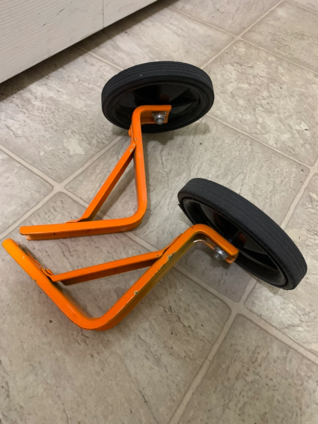 Pair of orange bicycle training wheels with black tires. These'll help a new rider gain confidence and balance on their bike. Sturdy metal construction for durability.
