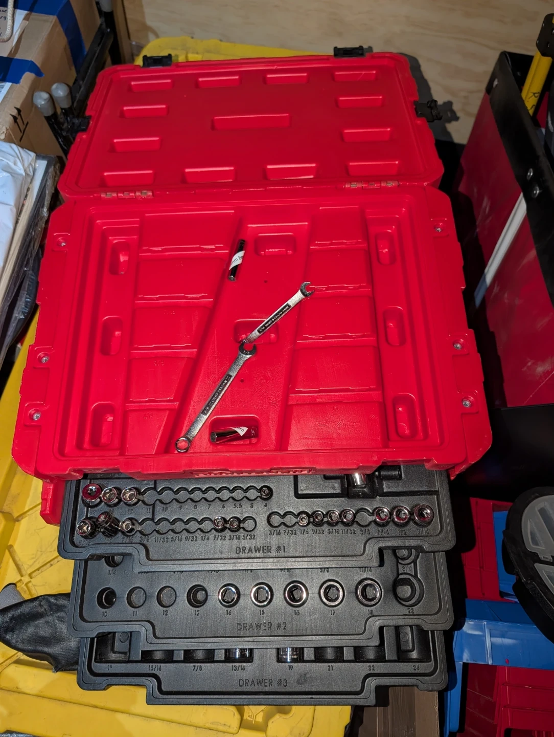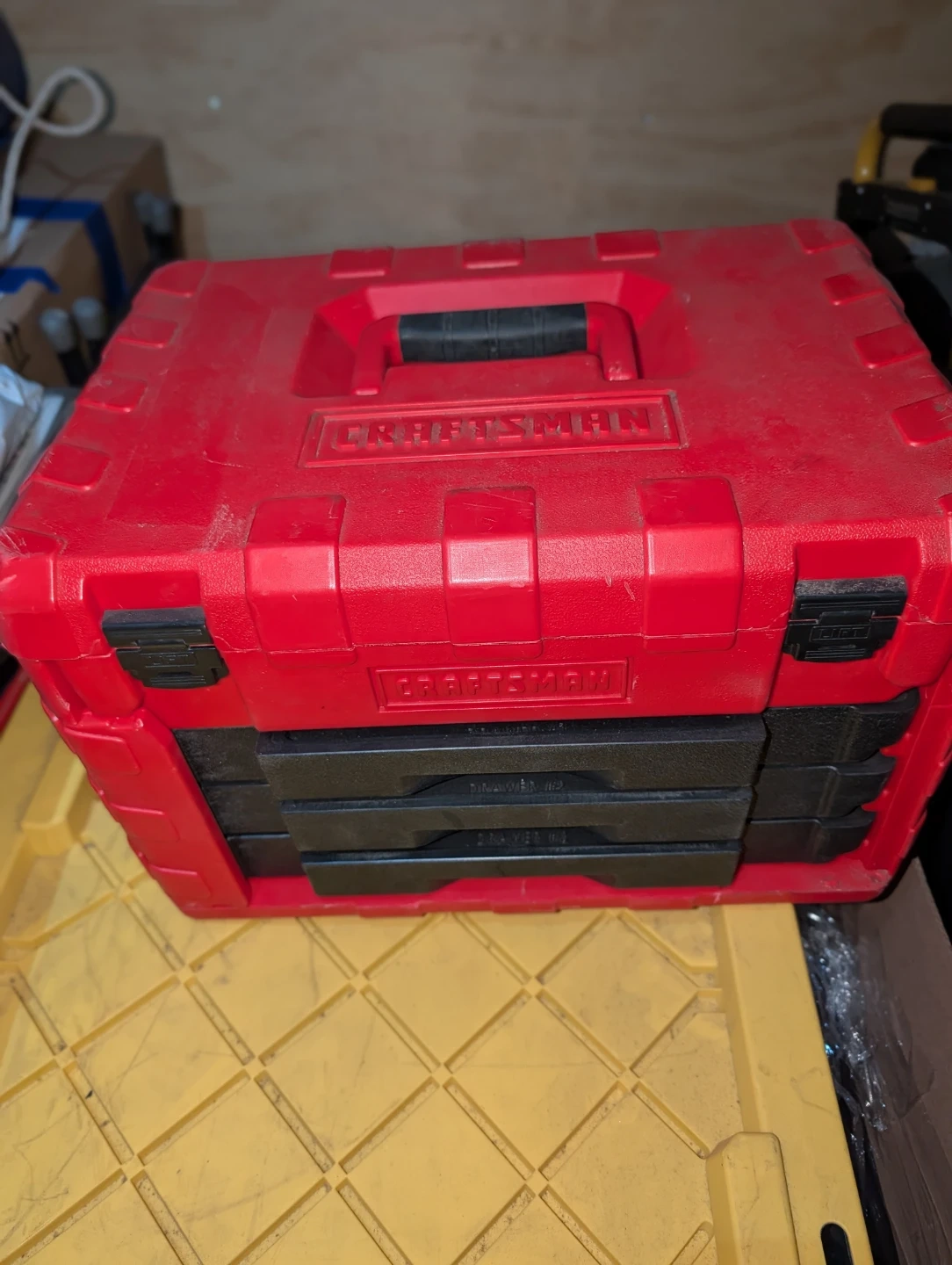 This red Craftsman tool chest contains a socket set with multiple drawers. Includes various sizes of sockets. Sold as is. Case is like new, most of the socket drivers are new
