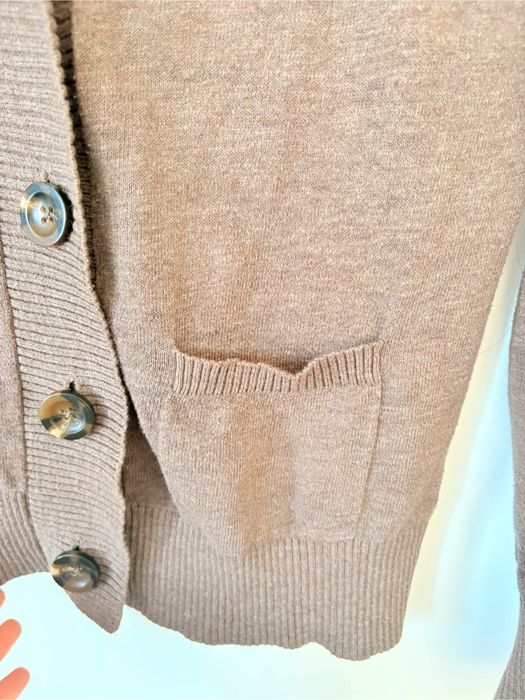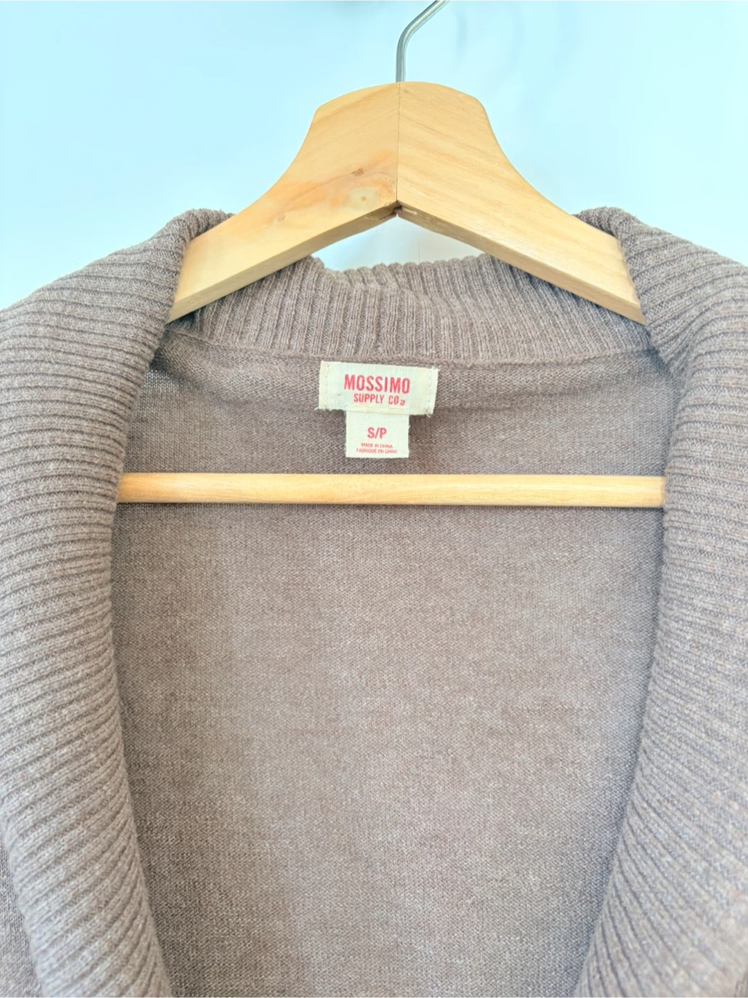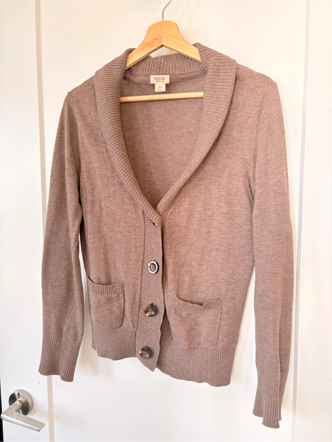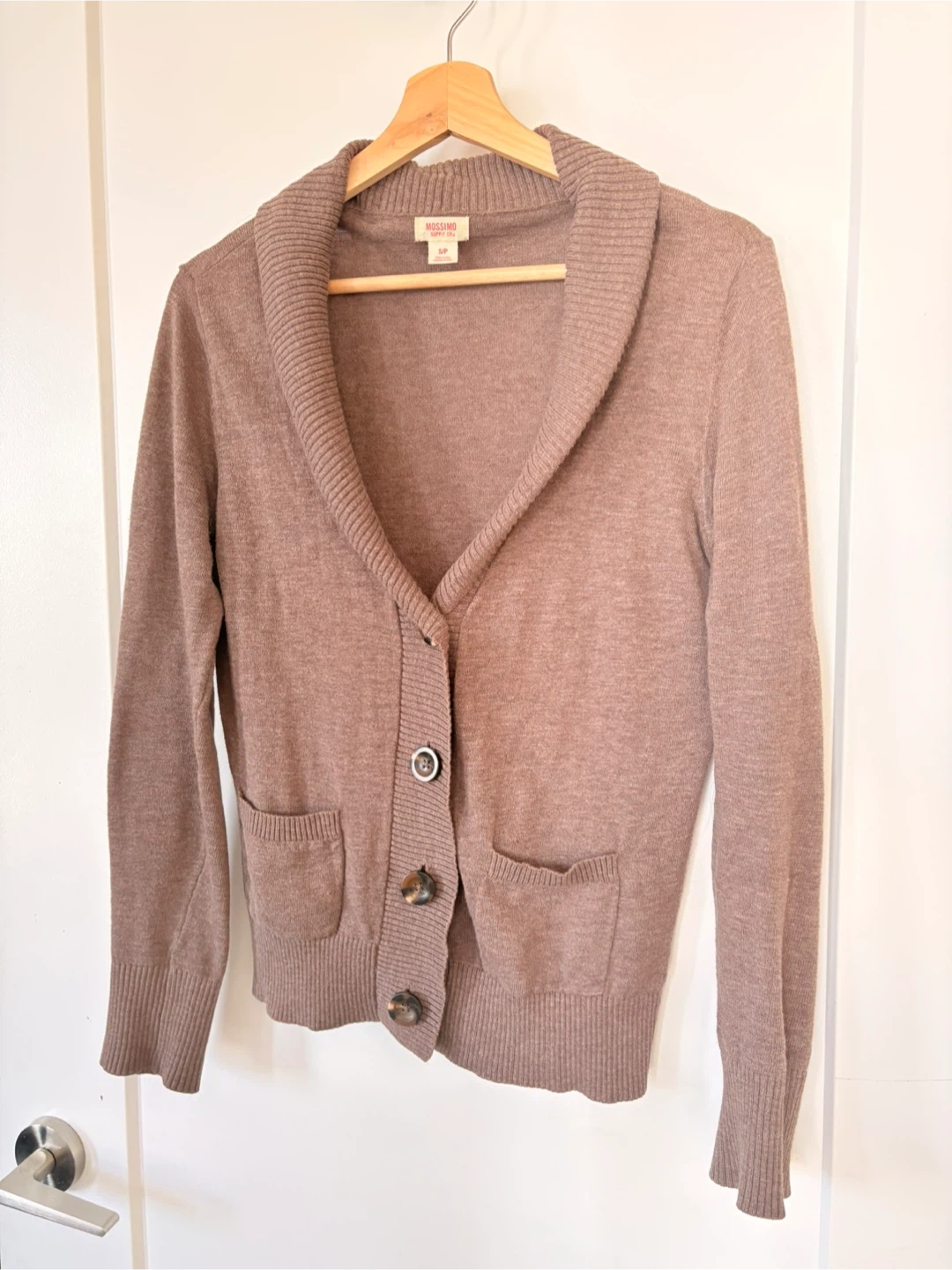 Mossimo Supply Co. women's cardigan sweater in a nice brown colour. It has a shawl collar and button-up front. Features two front pockets. Size S/P. A cozy layer for cooler days!