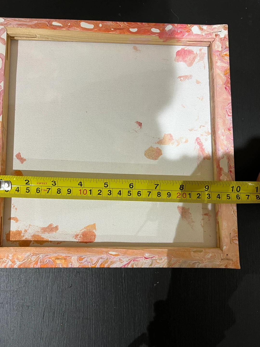 Acrylic pour painting on a stretched canvas. Features swirling patterns in shades of orange, pink, white, and a hint of purple. Canvas measures approximately 10 inches by 10 inches.