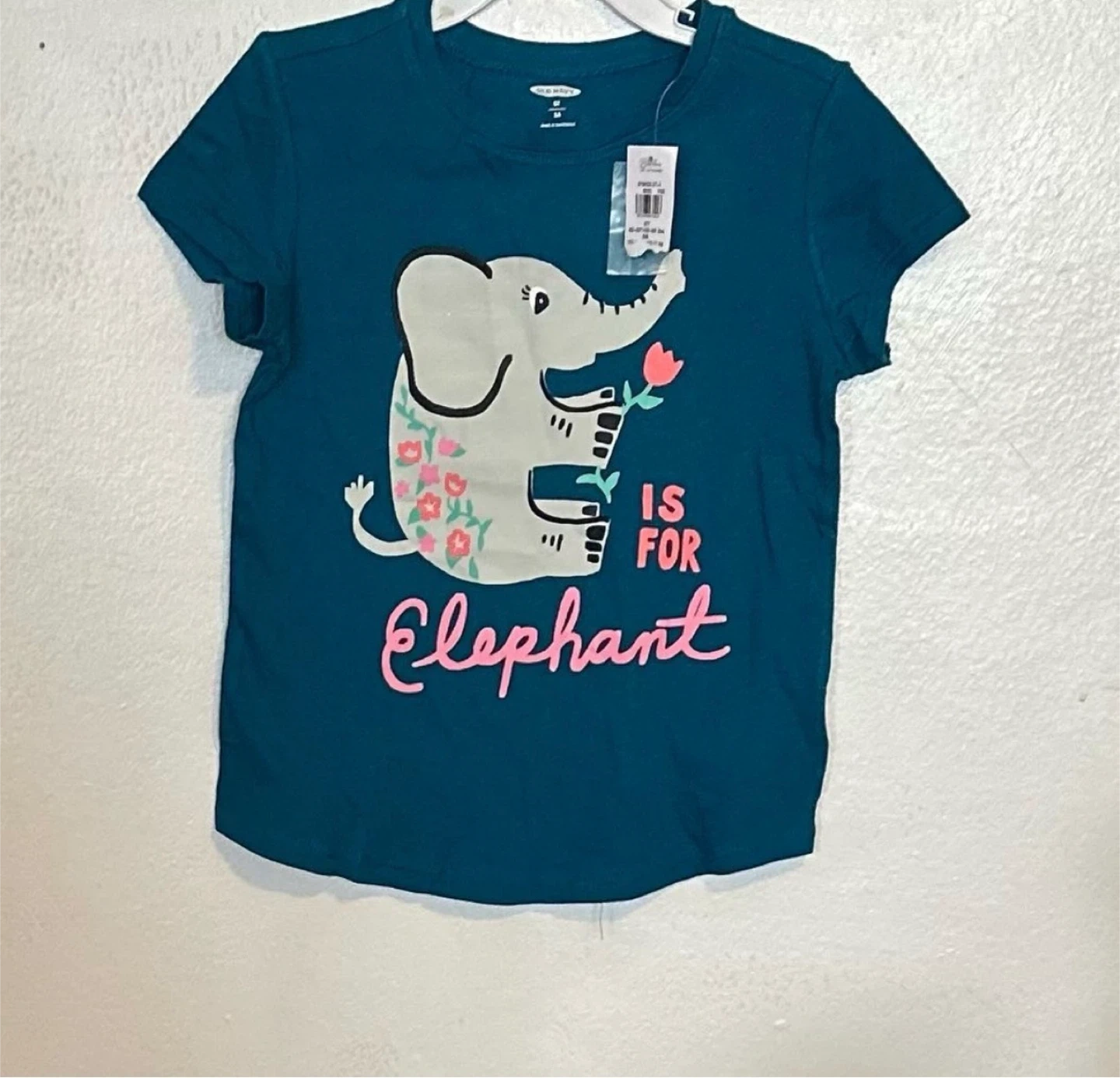 This Old Navy t-shirt features a fun elephant graphic with flowers. It's teal in colour and has short sleeves. A great piece for any little one's wardrobe!